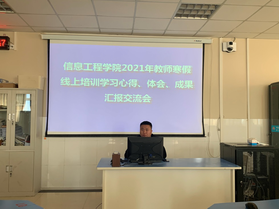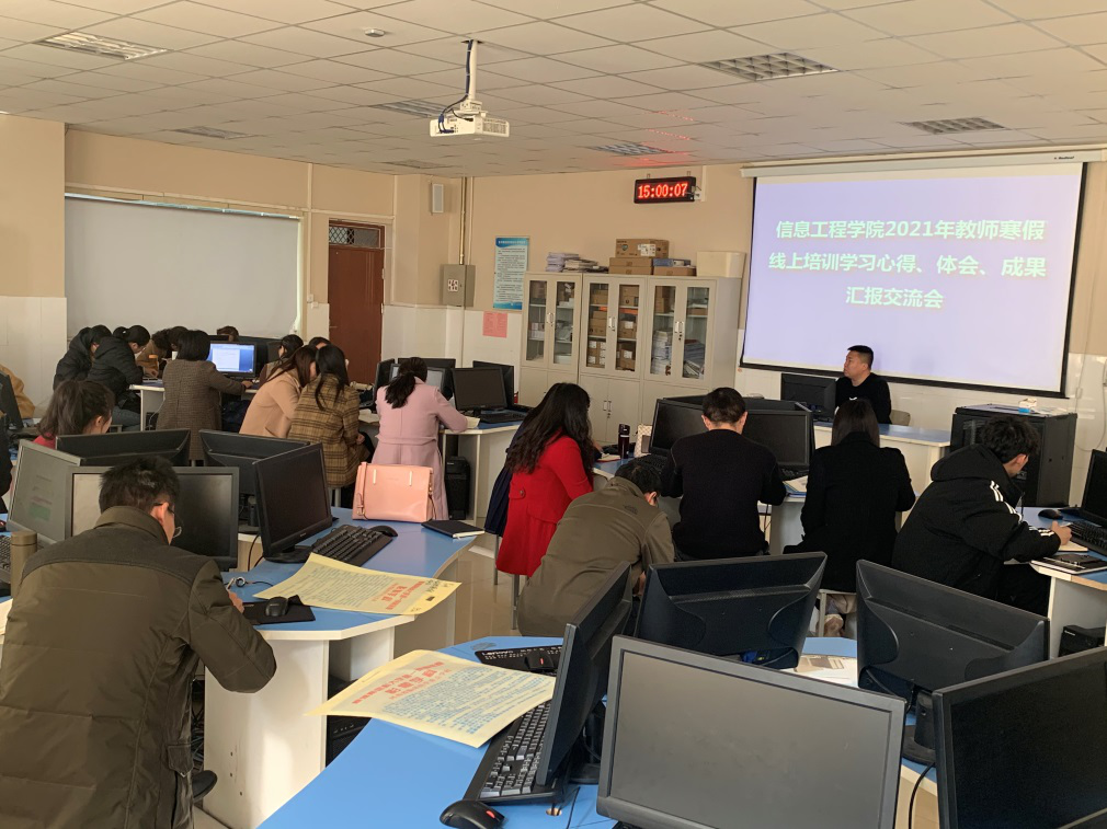 为提高我校教师教育教学能力,助力“双高校”相关任务建设,根据学校安排, 信息工程学院全体教师于2021年寒假期间参加学习了以“寒假教师线上培训”为主题的培训学习,为巩固寒假全体教师线上培训成果,进一步推动学校双高建设、三教改革、课程思政等工作持续深入进行,信息工程学院于2021年3月4日下午在网络实训室E416开展了教师寒假线上培训学习心得分享交流会。