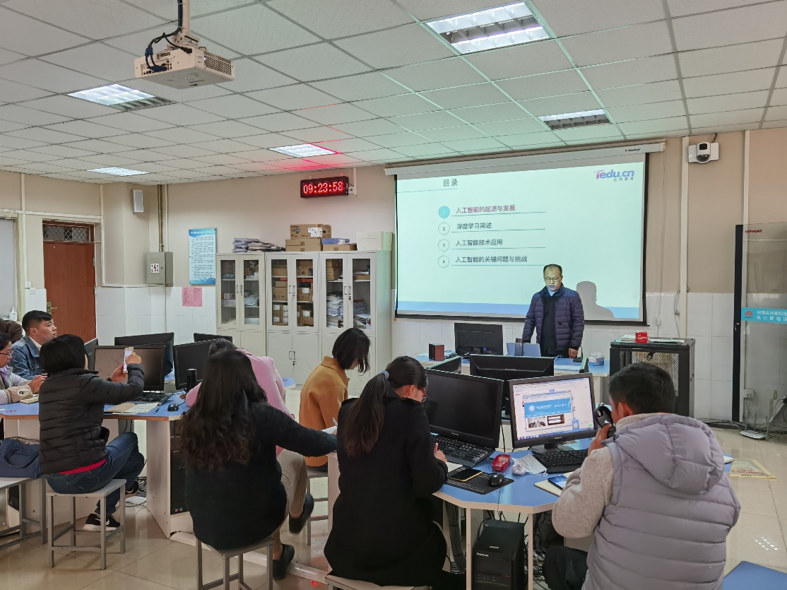 最后,由达内集团研究院金牌讲师裴广战老师对本次培训的专业内容展开培训。课程从人工智能基地设备、人工智能平台体系、机器学习、深度学习四个方面讲解,参会教师认真听取,受益匪浅。