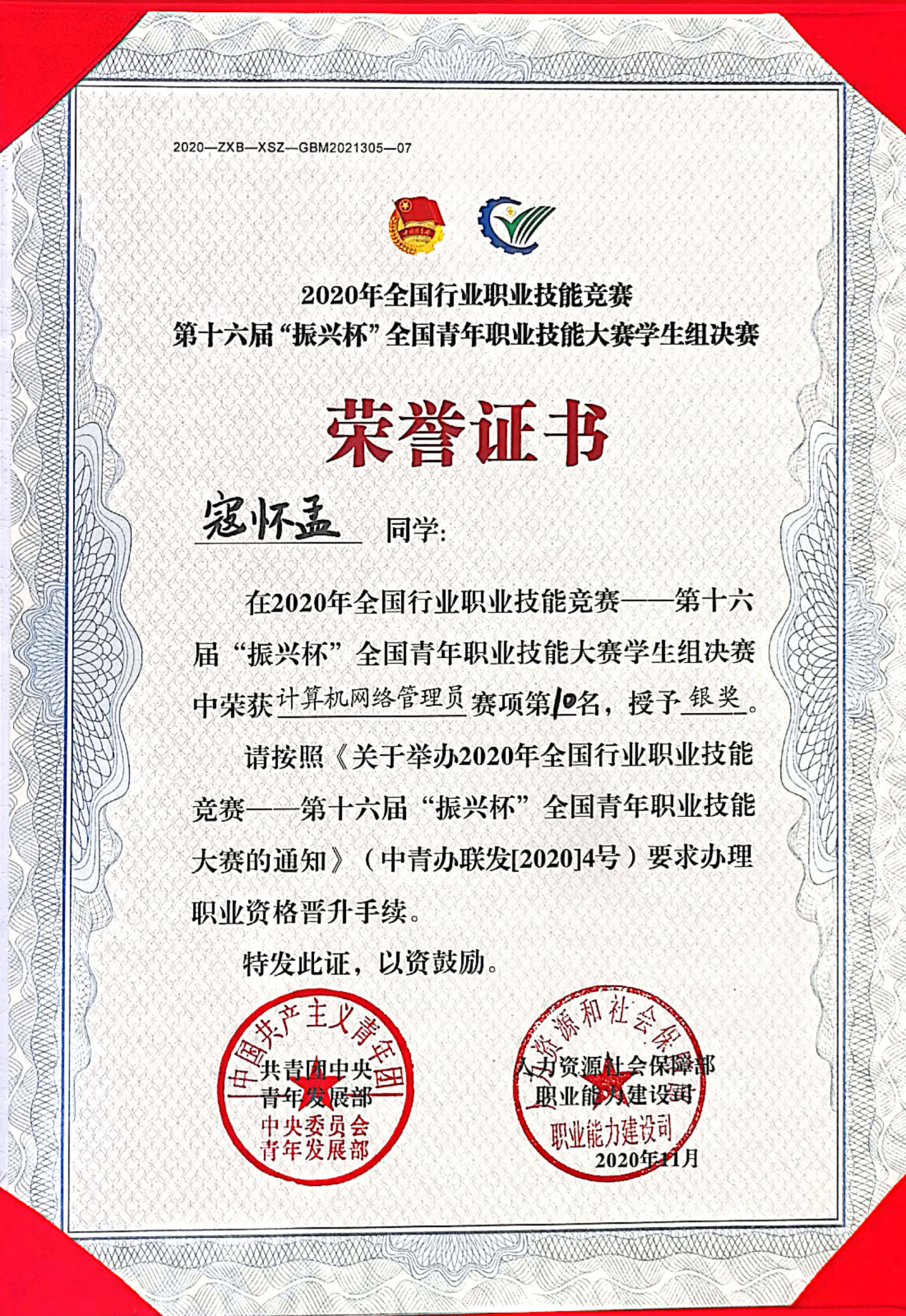 前期河南省赛层层选拔,我校信息工程学院2019级计算机网络技术专业寇怀孟(省赛第1名)、河南职业技术学院司亚迪(省赛第2名)和焦作师范高等专科学院张书栾(省赛第3名),三位同学组成河南省代表队,参加计算机网络管理员赛项单人赛。经过理论理论上机考试(30分)和工程实操(70分)两个环节的激烈比拼,来自30个省(区、市)、新疆生产建设兵团的83位选手中,我校寇怀孟同学凭借扎实的理论功底和实操技能,取得全国第10名的优秀成绩,最终为河南省取得唯一银牌,并获得“全国青年岗位能手”荣誉称号。本次比赛河南省代表队在计算机网络管理员、机床装调维修工、模具工(冲压)等3个职业(工种)全国比赛中获得1银6铜共计7枚奖牌。