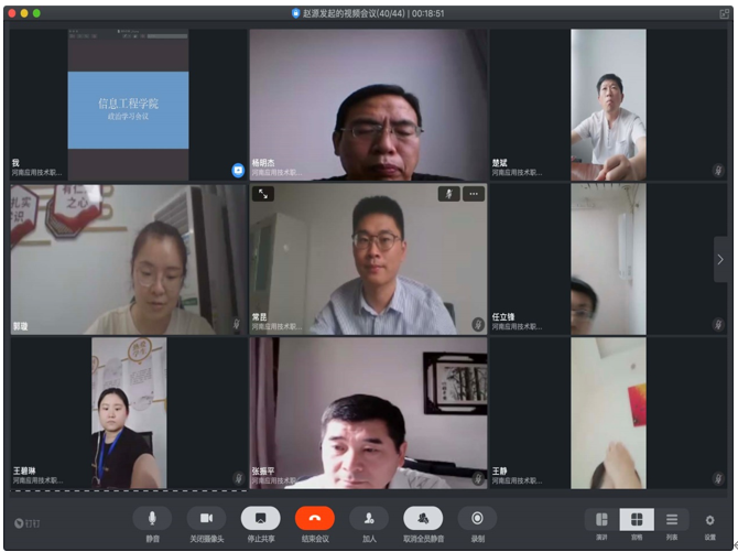 2020年6月9日下午,根据学校党委安排,信息工程学院党总支东西校区共同召开视频会议,学习了《高等学校课程思政建设指导纲要》和《政府工作报告》,杨明杰书记主持了会议。