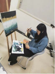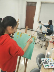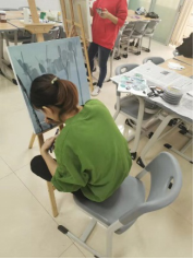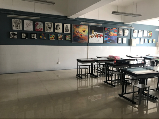 在河南应用技术职业学院有一间特别的教室,实训楼E403画室。深青灰色的背景墙代表着专注认真。