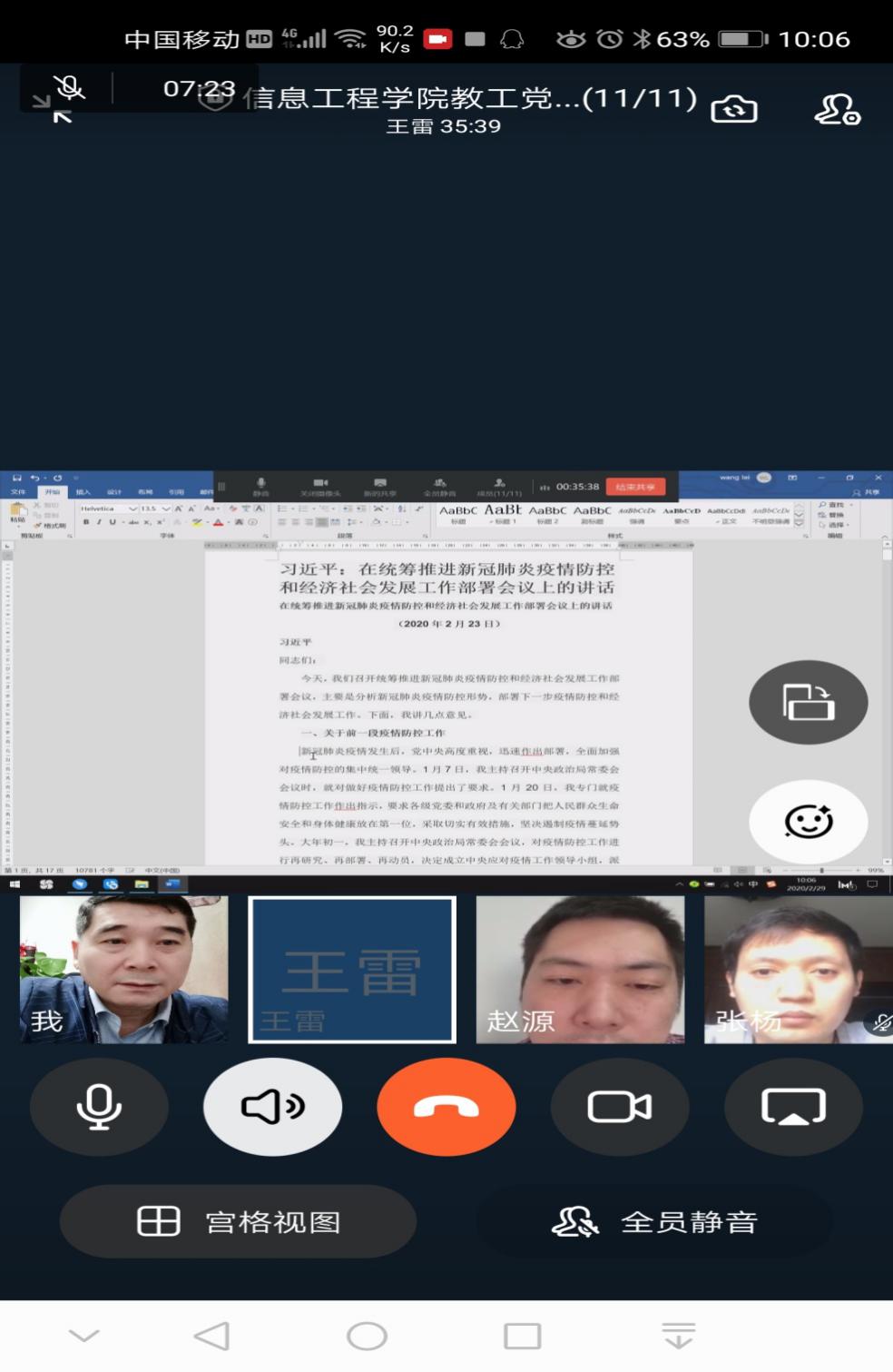 根据学校《关于开展“守初心、献爱心、战疫情、做先锋”线上主题党日活动的通知》精神,信息工程学院党总支学生第一支部、学生第二支部和教工支部于2020年2月29日上午10:00分支部召开视频会议,认真开展了主题党日活动。各支部首先学习了《习近平在统筹推进新冠肺炎疫情防控和经济社会发展工作部署会议上的讲话》。