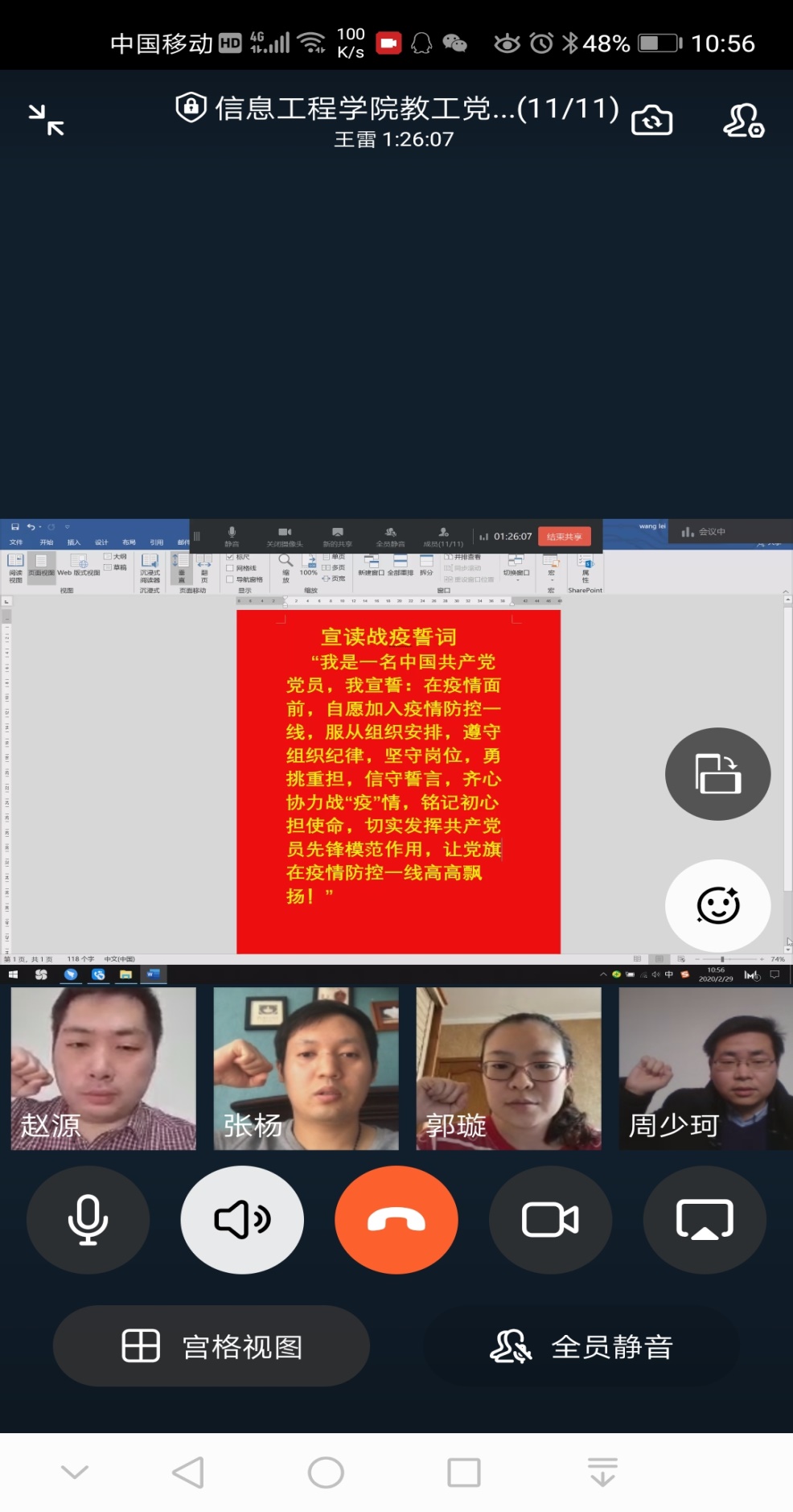 会议的第二个议程是全体党员认真宣读“战疫誓词”。