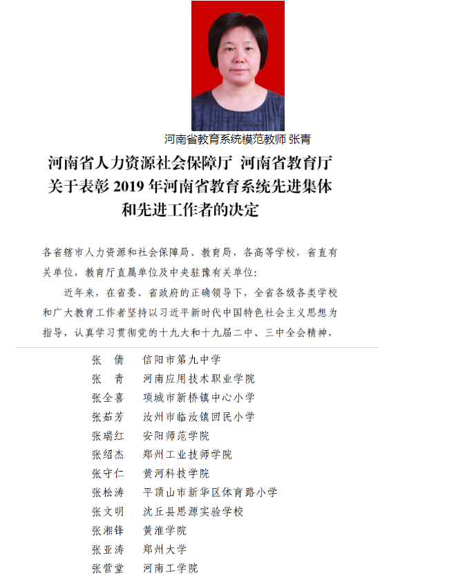 近日,省人力资源社会保障厅,省教育厅公布了关于表彰2019年河南省教育系统先进集体和先进工作者的决定,我校张青老师荣获2019年河南省教育系统模范教师荣誉称号。