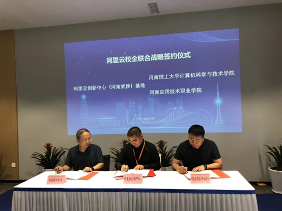 2019年6月19日,阿里云河南创新中心校企合作签约暨武陟智能硬件产业园揭牌仪式在焦作武陟进行。华夏幸福集团、阿里云集团和武陟产业新城联合打造现代大数据、云计算物联网河南产业集聚区。信息工程学院王雷院长带队参加了此次揭牌仪式和校企合作共建项目启动仪式,抢抓产学研新技术应用的机遇,将我校校企合作对接高新技术产业,立足河南、服务河南。