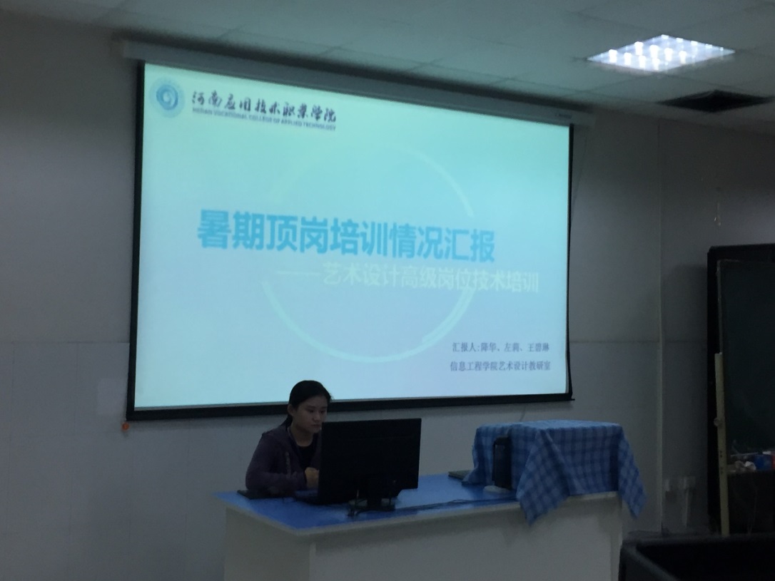 为不断提升专业技能、掌握行业新知,了解行业最新的发展现状和走向;让教法贴近学生,让教学贴近企业需求,以及加深学校教学和企业实际联系的理解。信息工程学院艺术设计教研室老师降华、左莉、王碧琳于2018年7月1日---2018年7月31日在郑州市高新区郑州AAA数字艺术教育进行顶岗培训。因此培训受益良多,三位教师于11月中旬向信息工程学院领导、教师汇报此次培训内容。