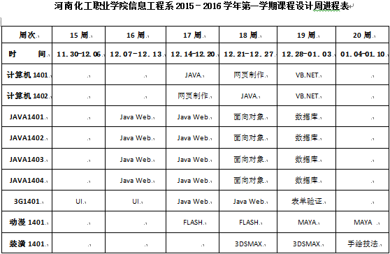 我系部分专业班级从第十五周开始进入课程设计周,请任课教师按照要求提前制定出课程设计任务书并告知学生,教师在制定课程任务书时要体现出设计周是对前段时间学习的总结和综合训练,不是课堂练习,注意题目的综合性、代表性、先进性和覆盖面,题目为一个(严禁任务书为多个练习题组合的模式)。请一并将设计任务书提前发送到黄主任QQ信箱中。