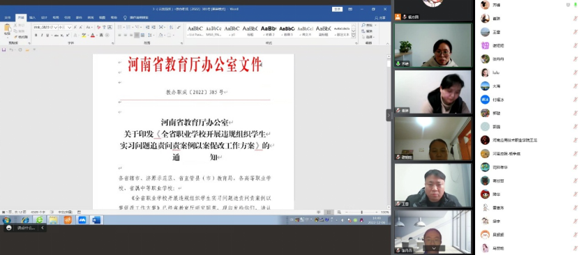 2022年12月6日下午,信息工程学院全体行政人员、辅导员及专兼职教师按照教务处安排,通过腾讯会议由主管顶岗实习的齐峰副院长领学了“河南应用技术职业学院学生实习管理办法(试行)”、“河南省教育厅办公室关于做好2022-2023年职业院校学生实习有关工作的通知”和“全省职业学校开展违规组织学生实习问题追责问责案例以案促改工作方案”三个文件。