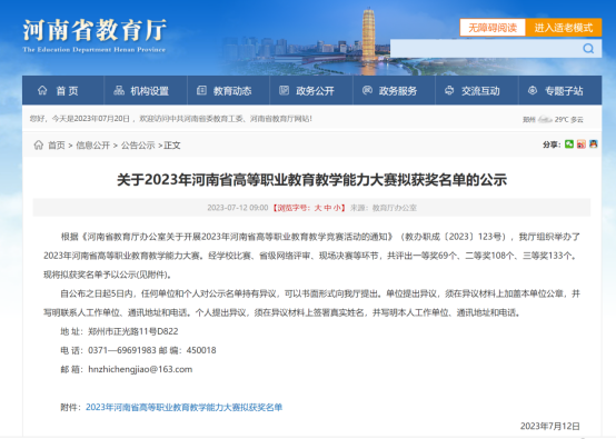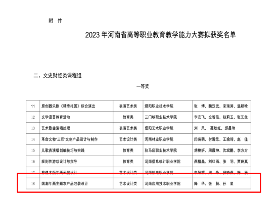 近日,河南省教育厅公示了2023年河南省高等职业教育教学能力大赛获奖名单,信息工程学院教师团队(降华 张蔚 孙星)的参赛作品《国潮年画主题农产品包装设计》荣获艺术设计类课程组一等奖。这是我院获得的又一个教师技能比武省级荣誉,实现了我院及我校在全省职业院校教学能力大赛艺术设计类课程组的新突破。
