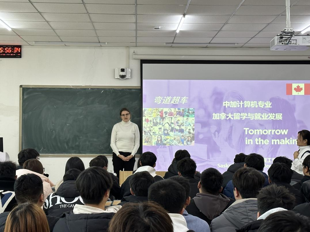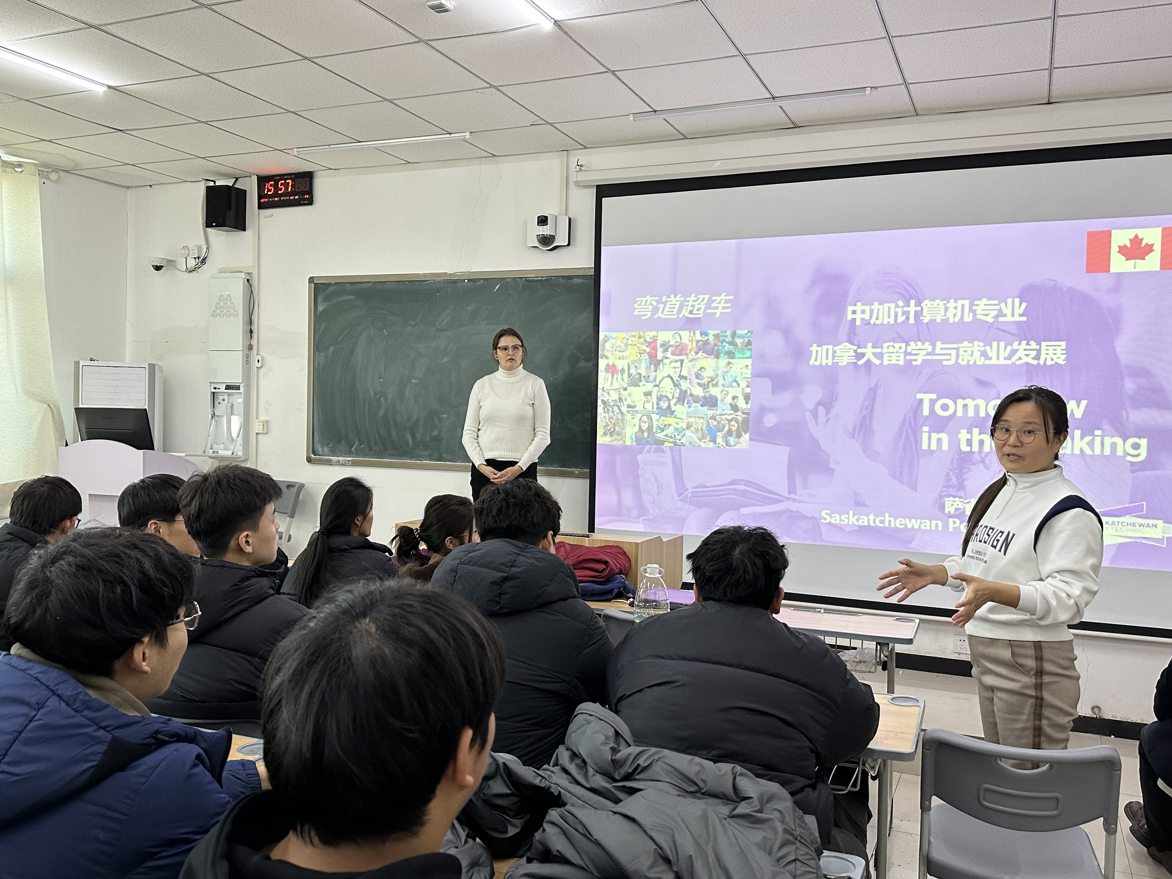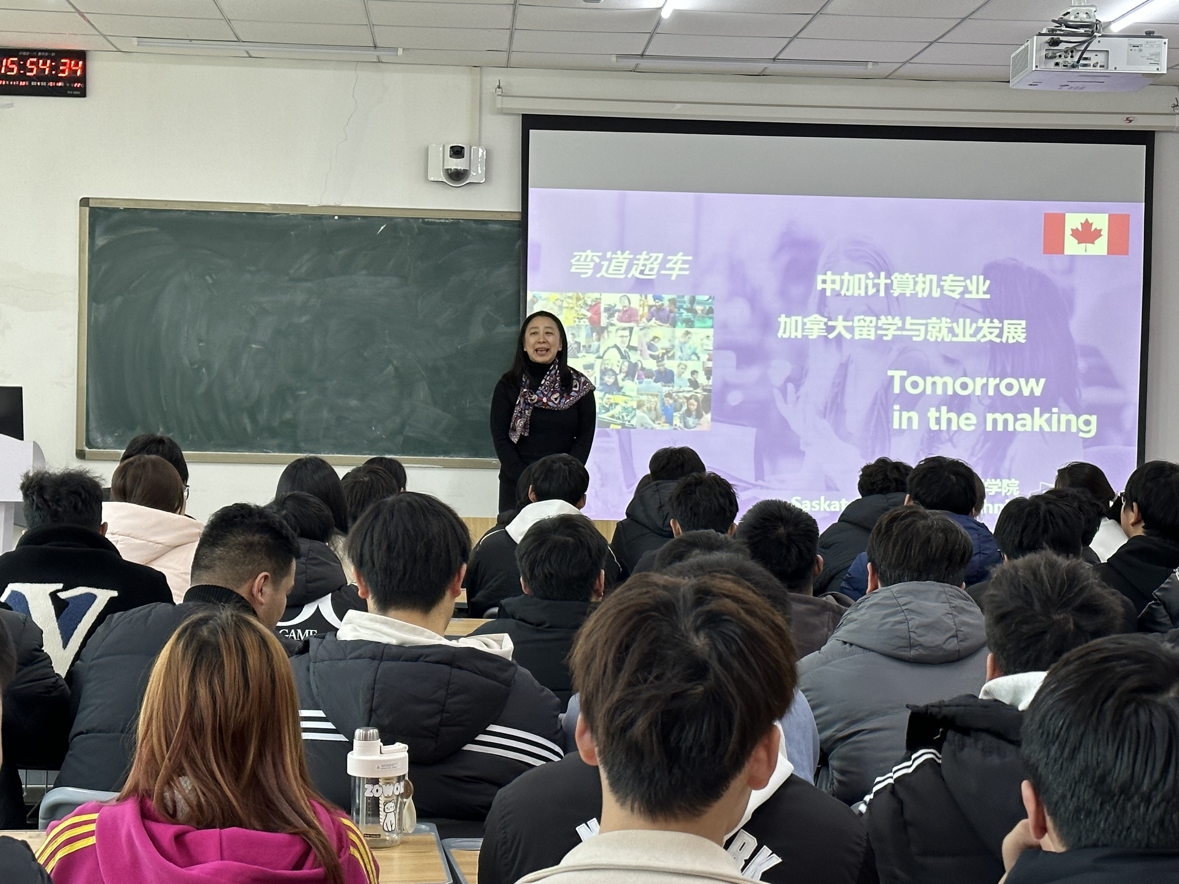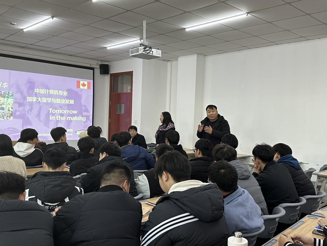 为进一步帮助22级计算机应用技术(中外合作办学)专业学生了解留学政策和国外的生活日常,解答相关外方课程学习问题,11月30日下午,信息工程学院邀请萨省理工学院校方代表Grace Liu刘主任、于国强主任和Jennifer老师在双创楼多媒体教室学生开设讲座并召开交流分享会。信息工程学院相关领导、项目负责人、相关专业教师以及22级全体学生参与。