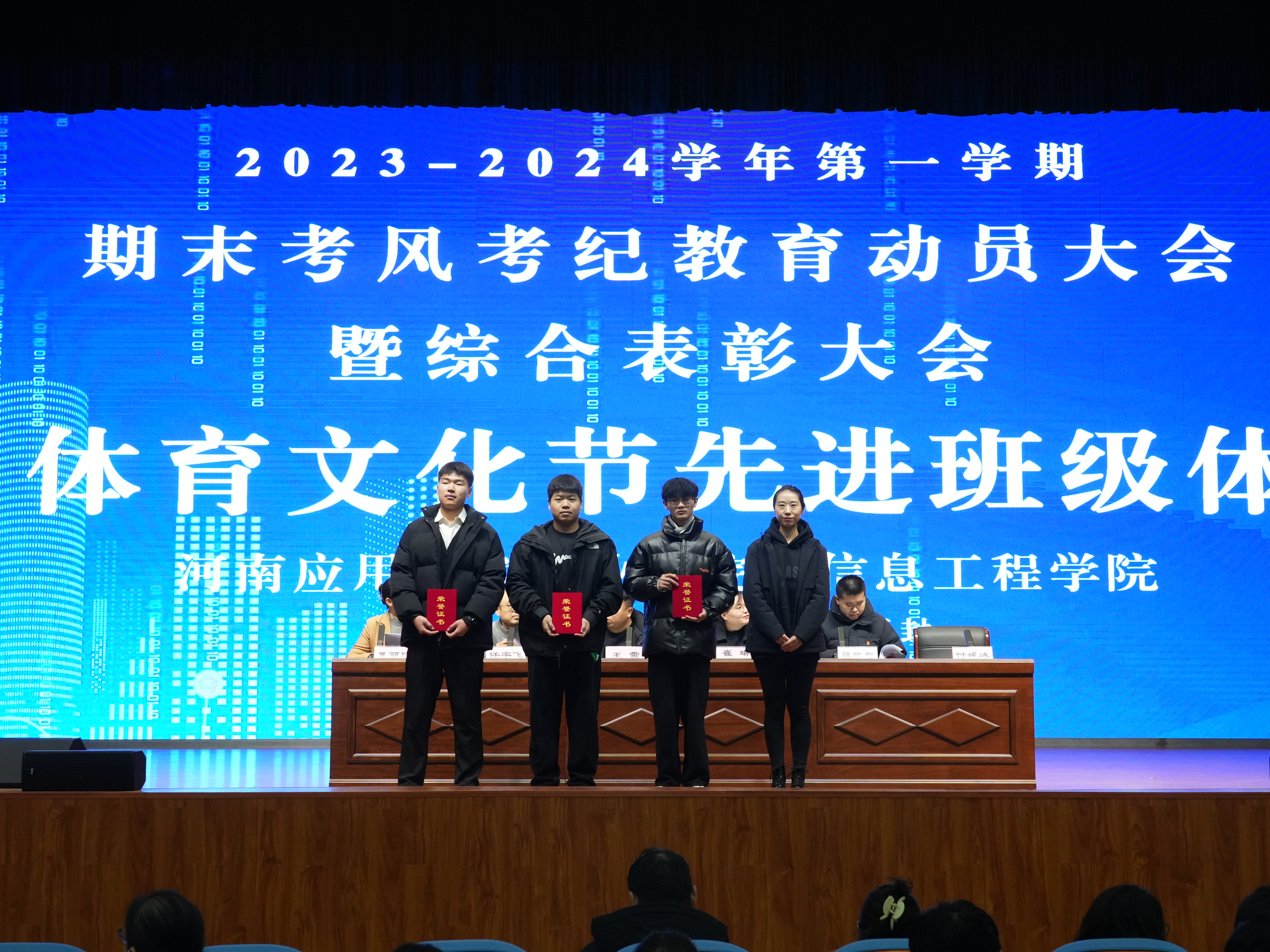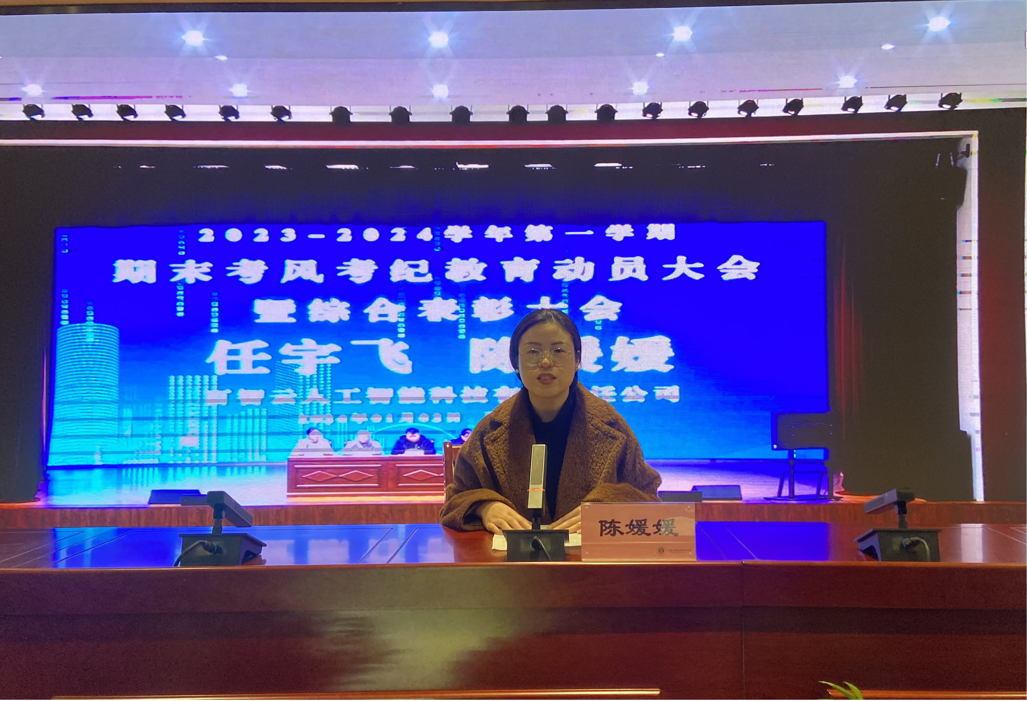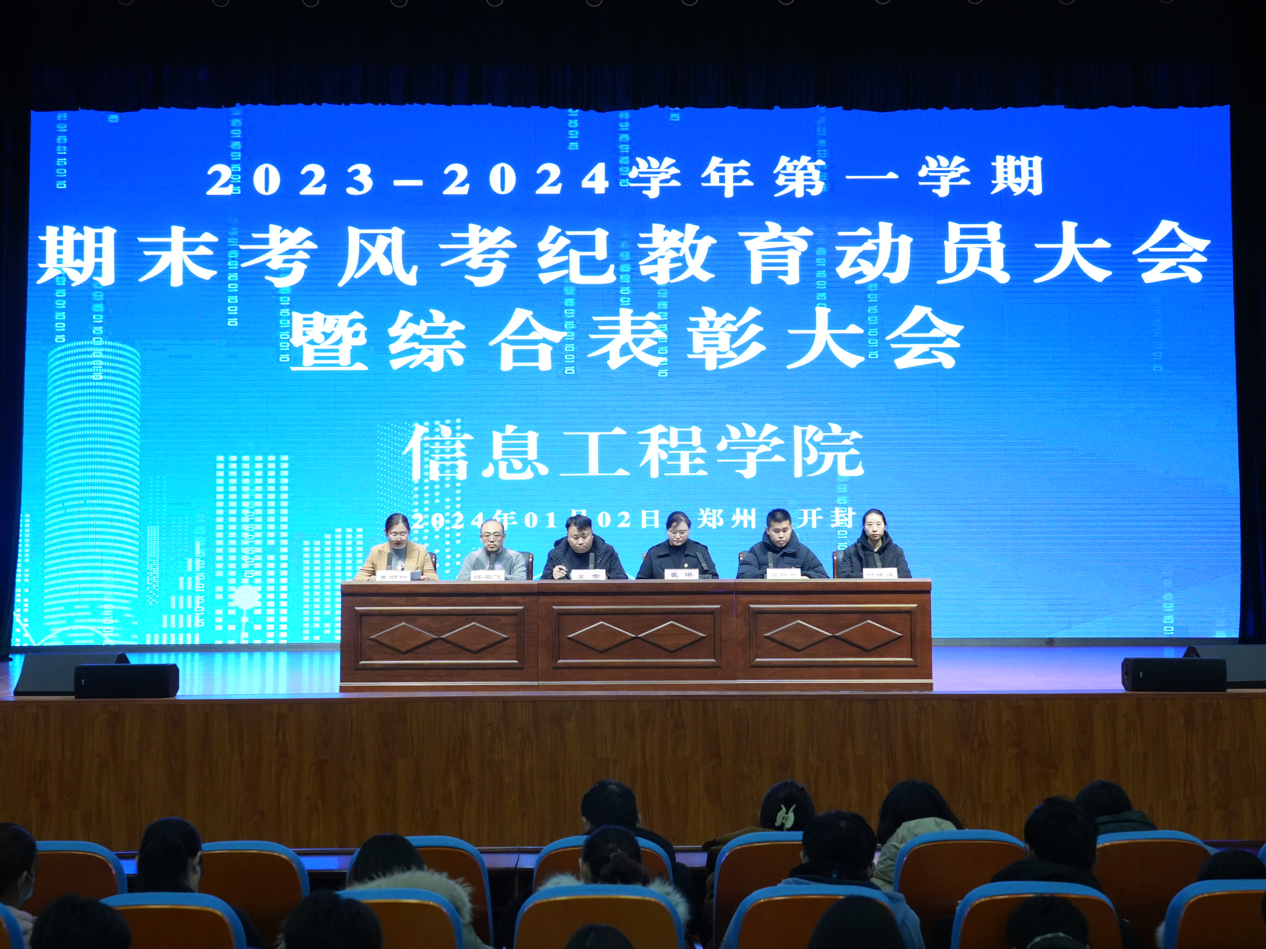 为进一步响应我校关于考风考纪的号召,加强考风、班风、学风的建设,让全院学子以良好的心态、最佳的状态迎接期末考试,2024年1月2日下午,我院在郑州校区学生活动中心、开封校区教学楼A102同步召开信息工程学院2023-2024学年第一学期期末考风考纪教育动员大会暨综合表彰大会。信息工程学院院长王雷、党总支书记崔琳、副院长齐峰、副院长夏丽珍、党总支副书记蒋欣哲、党政办主任付媛冰、学工办主任常昆、团总支书记冷月、全体专兼职辅导员、教师代表和学院各班级学生代表参加了此次会议。会议由夏丽珍主持。