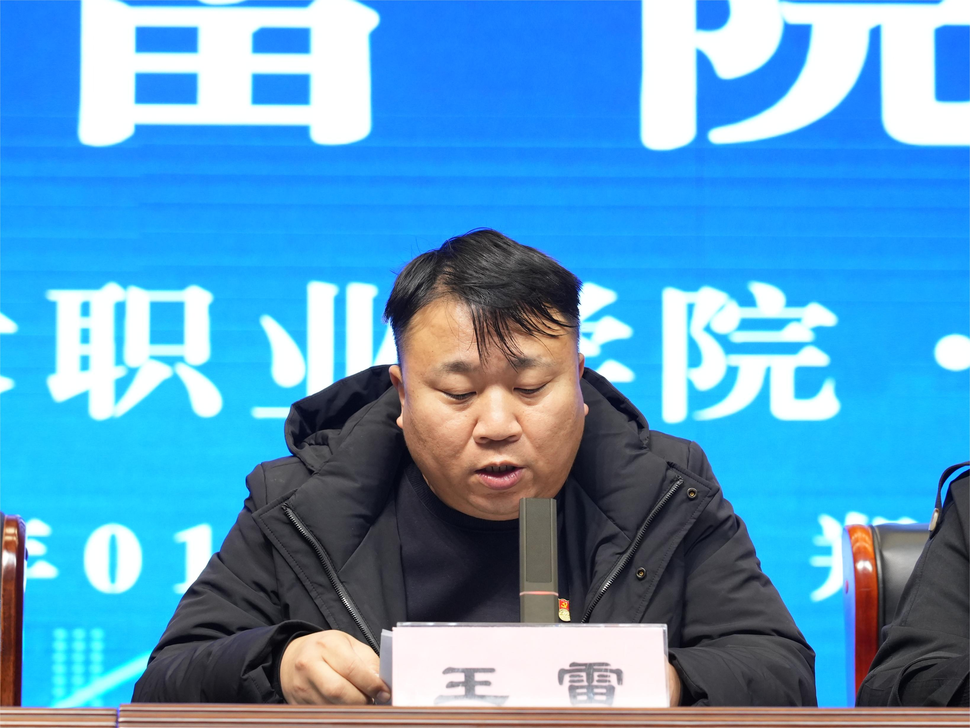 王雷在期末考风考纪动员讲话中向同学们提出三点要求:一是同学们要持有踏实上进的态度,不骄不躁,彰显积极向上的优良学风;二是殷切地希望同学们牢固树立“诚信考试光荣,违纪舞弊可耻”的意识:三是希望同学们保持良好心态,认真备考,争取好的成绩。