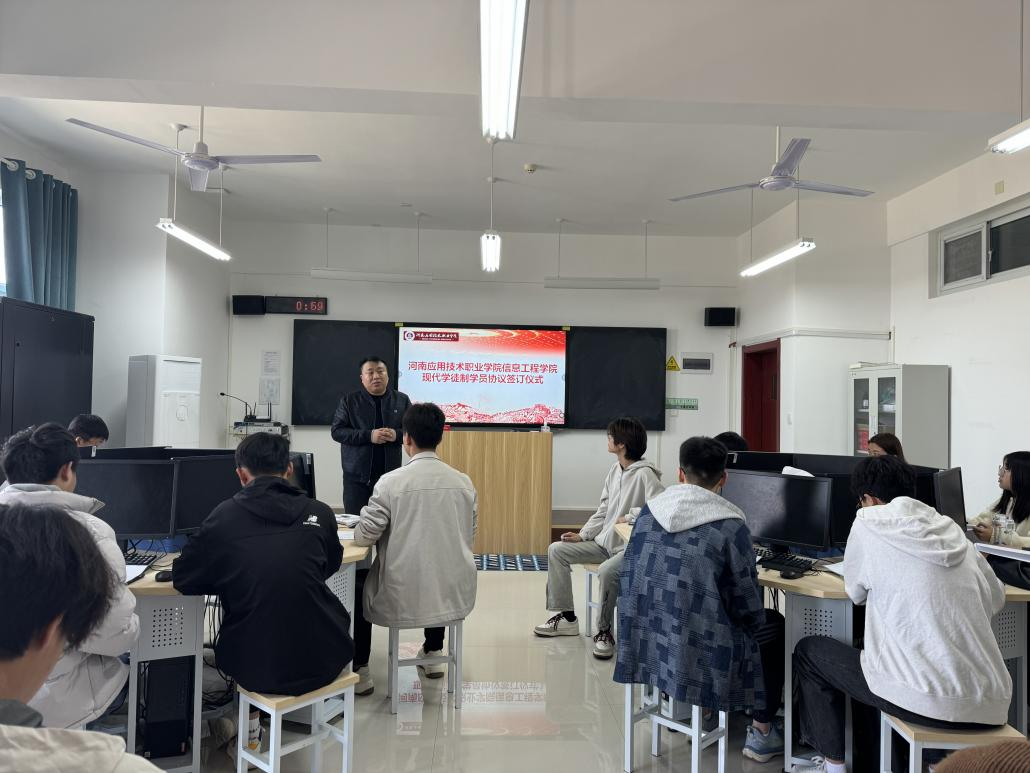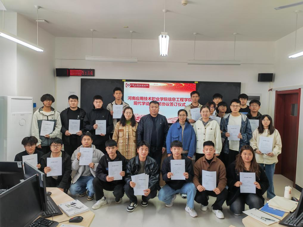 3月28日下午,信息工程学院在开封校区C304教室召开了省级现代学徒制第三轮学员协议签订仪式。仪式由信息工程学院院长王雷主持,副院长齐峰、夏丽珍出席了签约仪式,企业师傅代表和校企双元导师郭璇及“现代学徒制融合试点班”的20位学员参加了签约仪式。