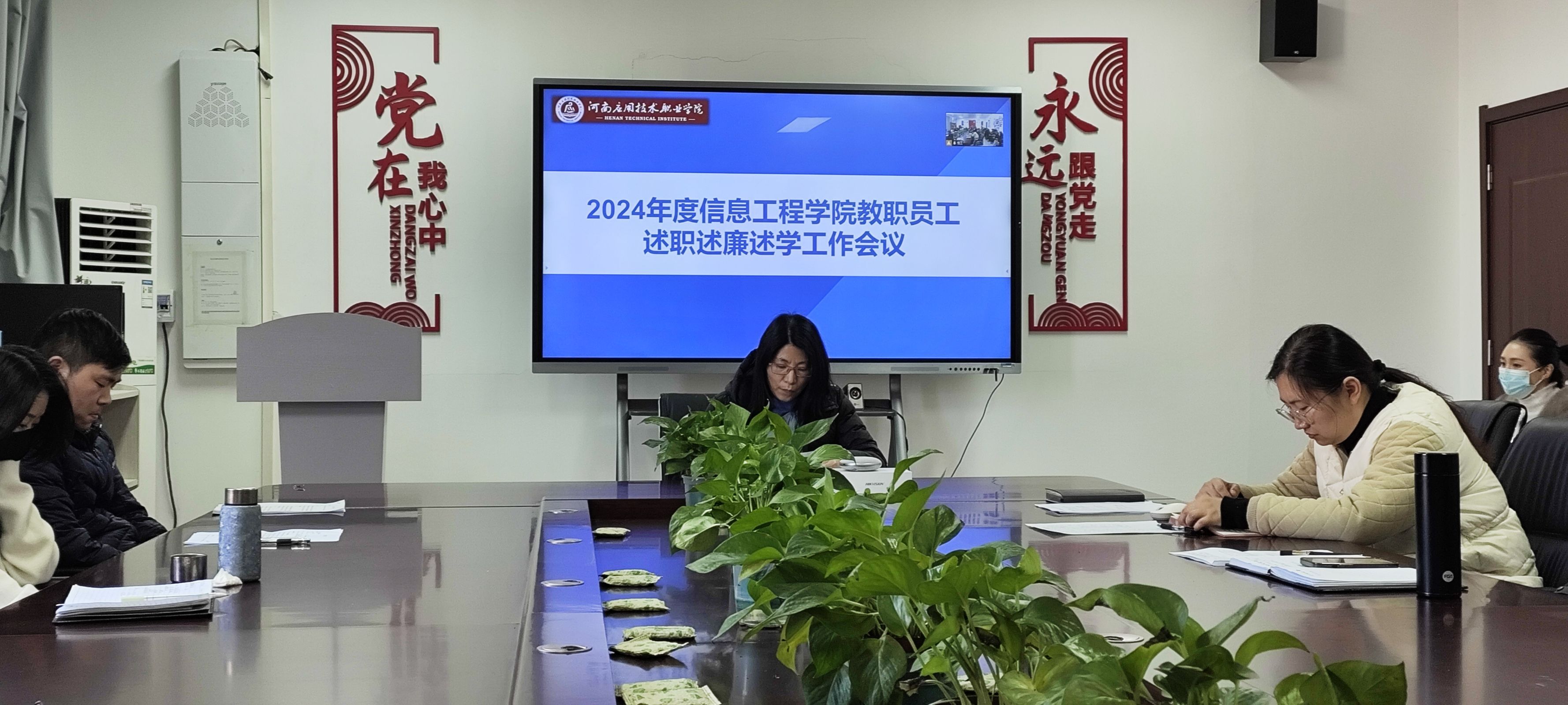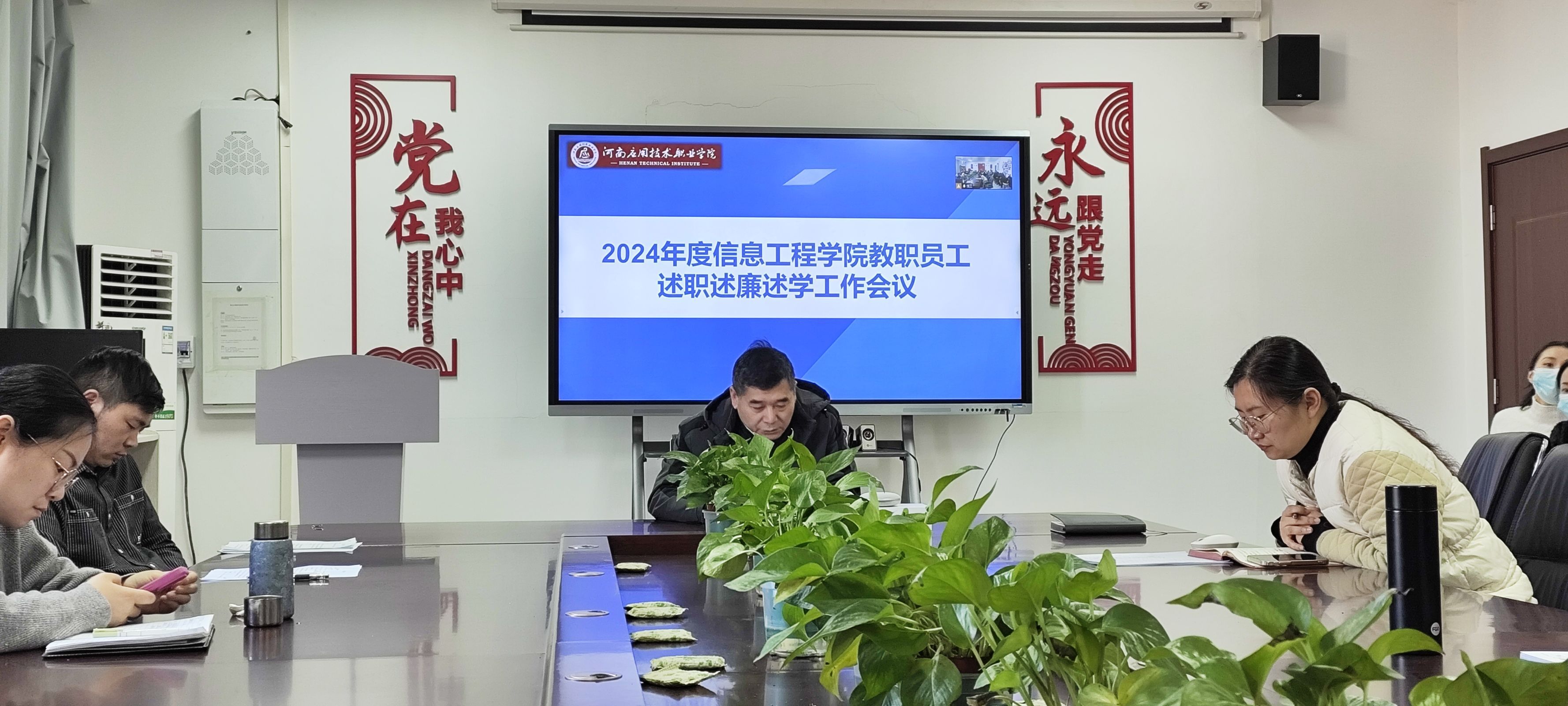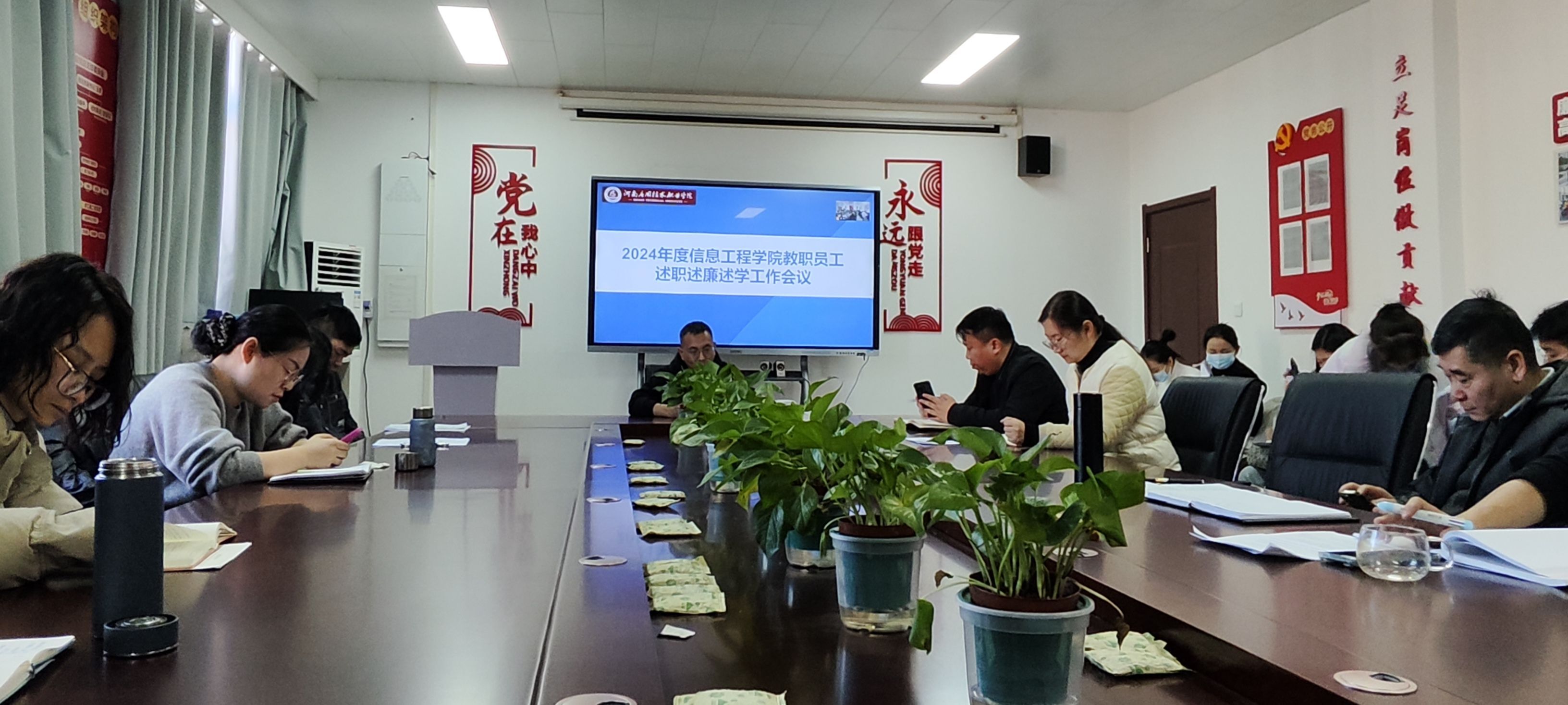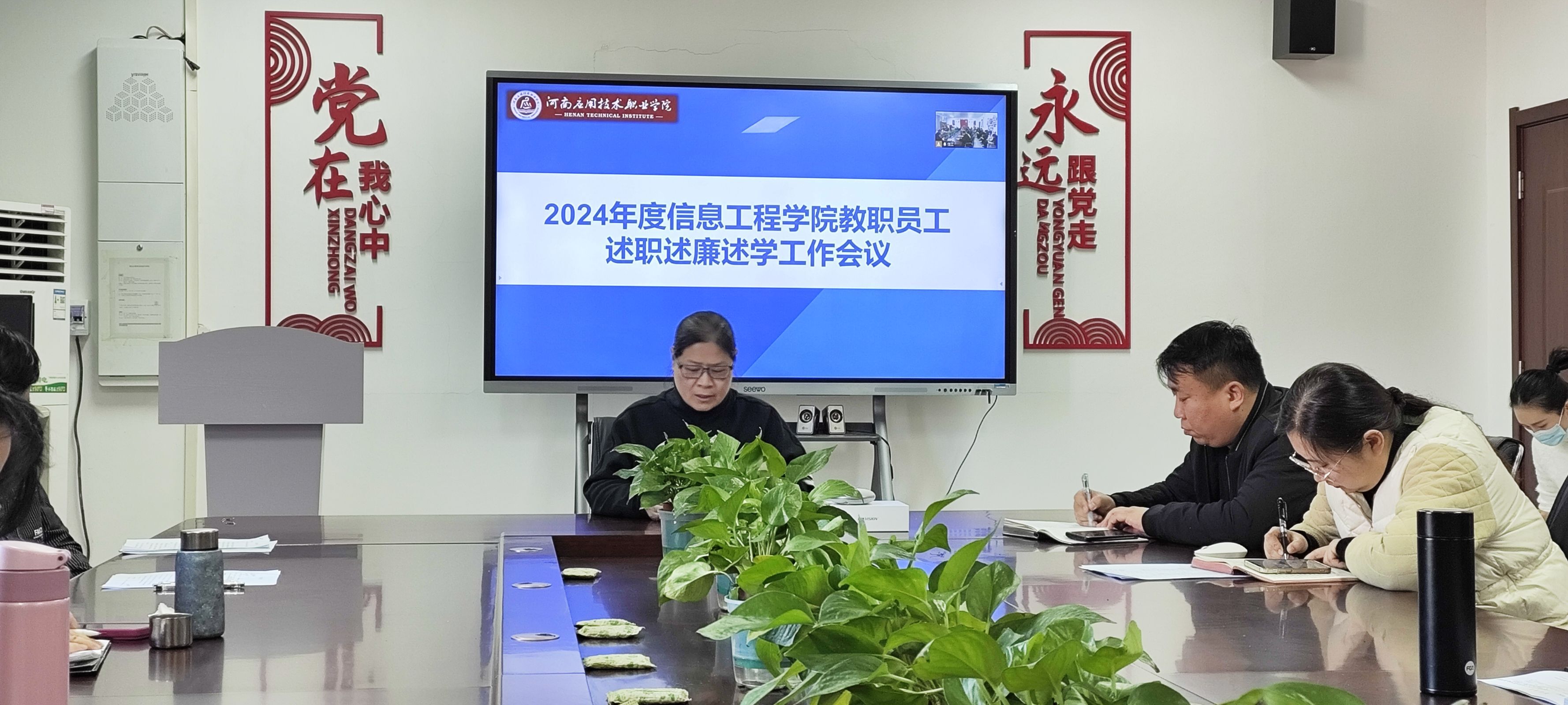 2025年1月15日,2024年度信息工程学院教职员工述职述廉述学工作会议在郑州校区A514、开封校区F314召开。会议由信息工程学院院长王雷主持并发表重要讲话。副院长夏丽珍、齐峰及全体教职工参加。