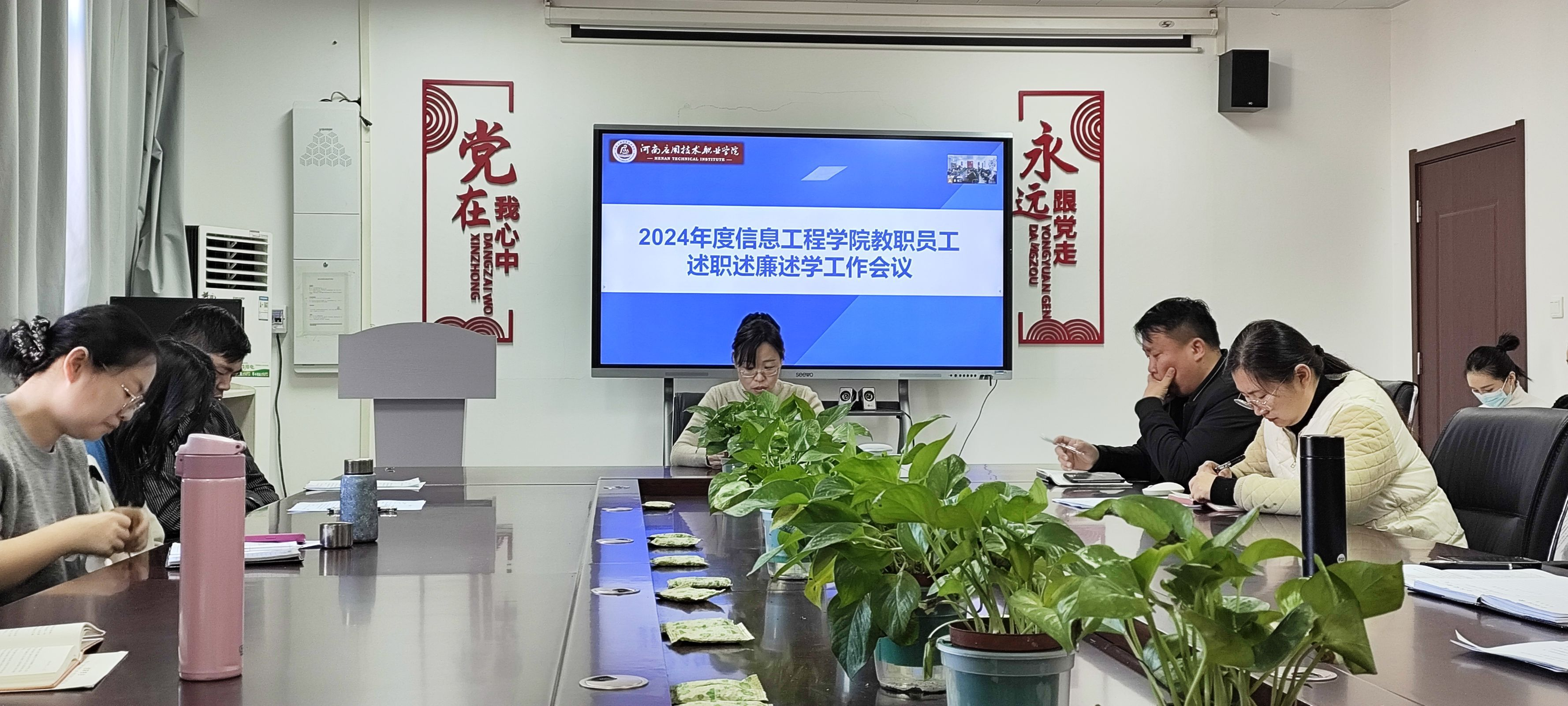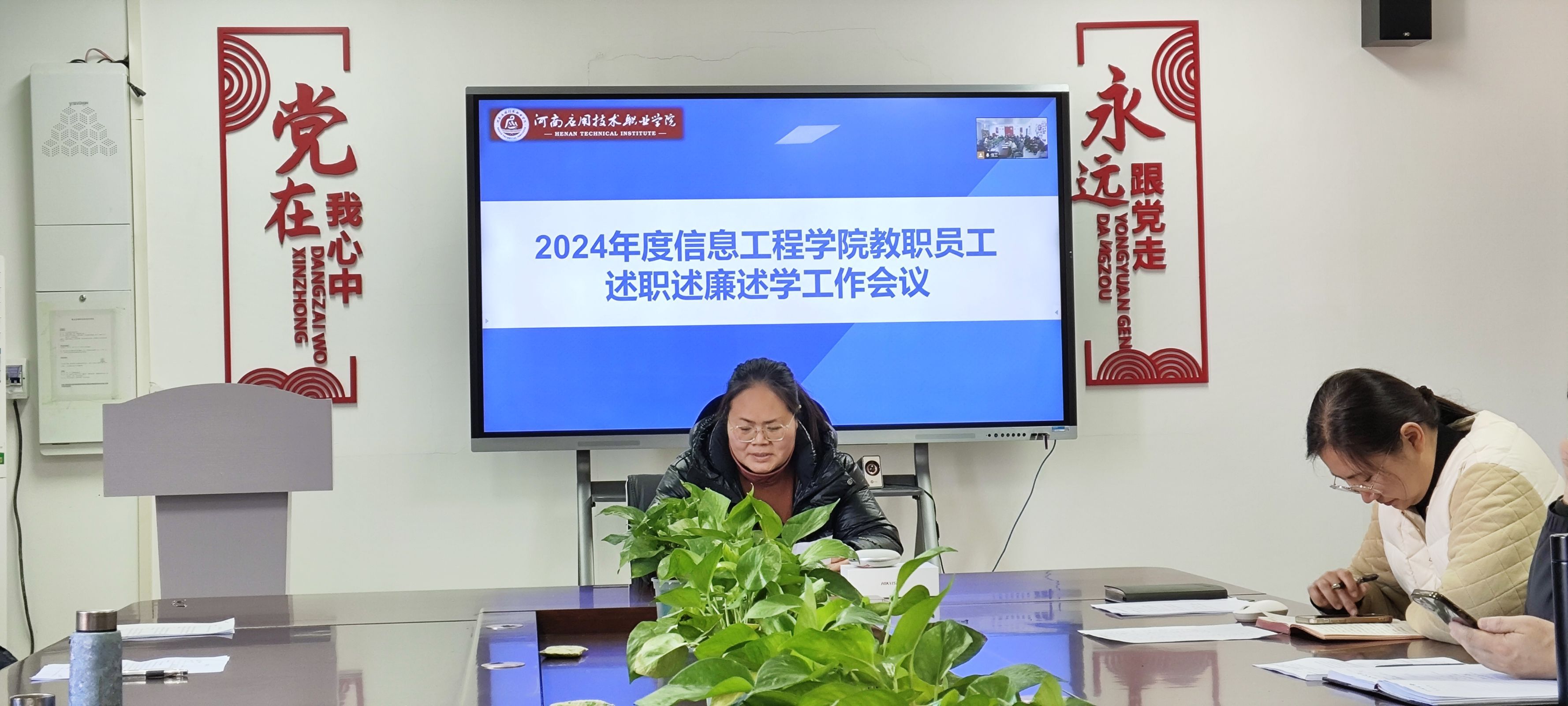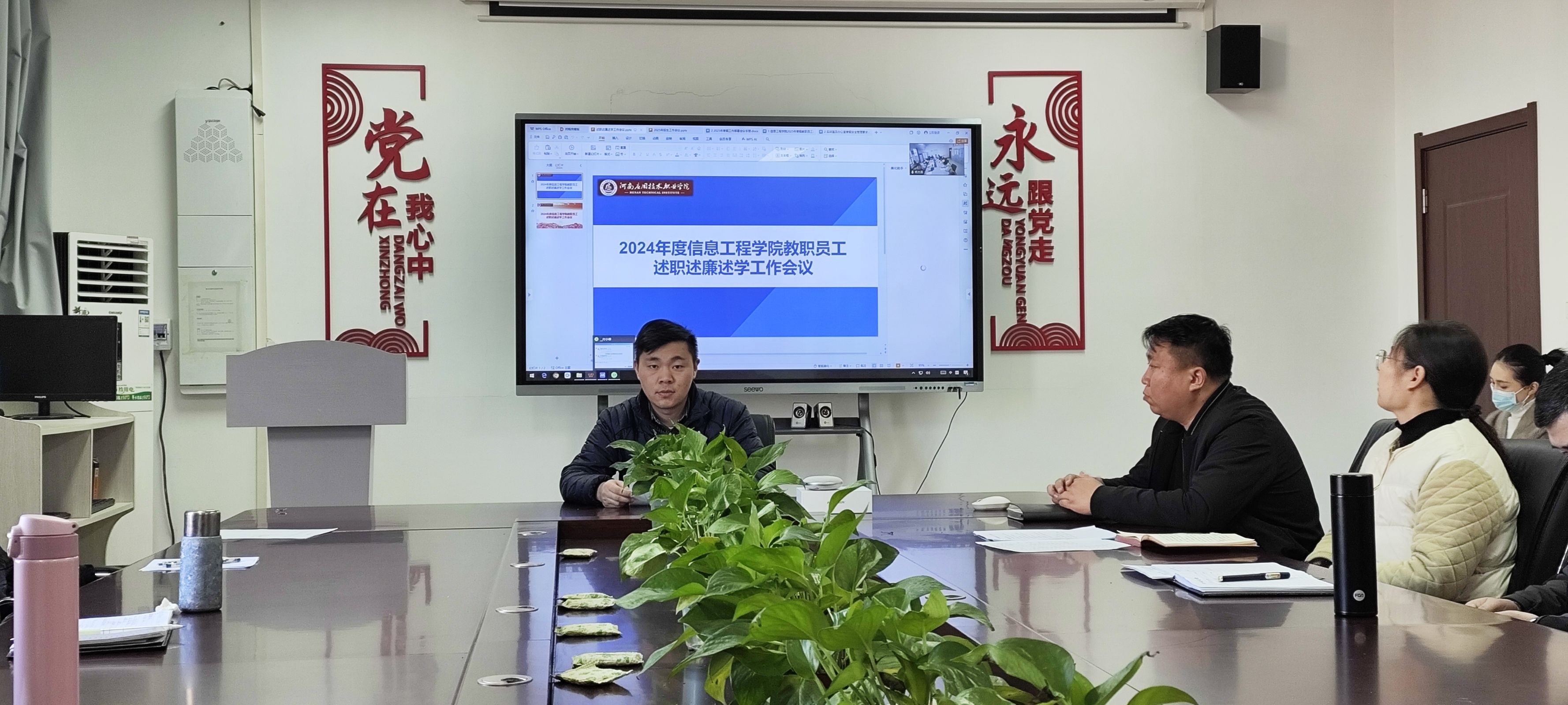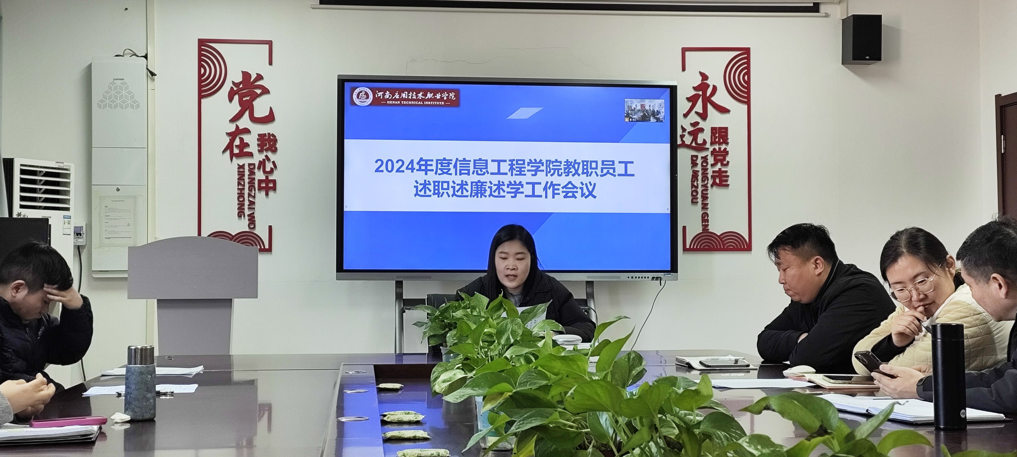 2025年1月15日,2024年度信息工程学院教职员工述职述廉述学工作会议在郑州校区A514、开封校区F314召开。会议由信息工程学院院长王雷主持并发表重要讲话。副院长夏丽珍、齐峰及全体教职工参加。