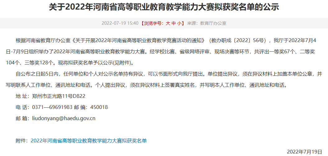 近日,2022年河南省高等职业教育教学能力大赛圆满落幕。经过激烈角逐,我校信息工程学院教师团队凭借出色的教学设计和现场表现,荣获财经农医相关类课程组二等奖,充分展现了我院教师扎实的教学功底和卓越的创新能力。