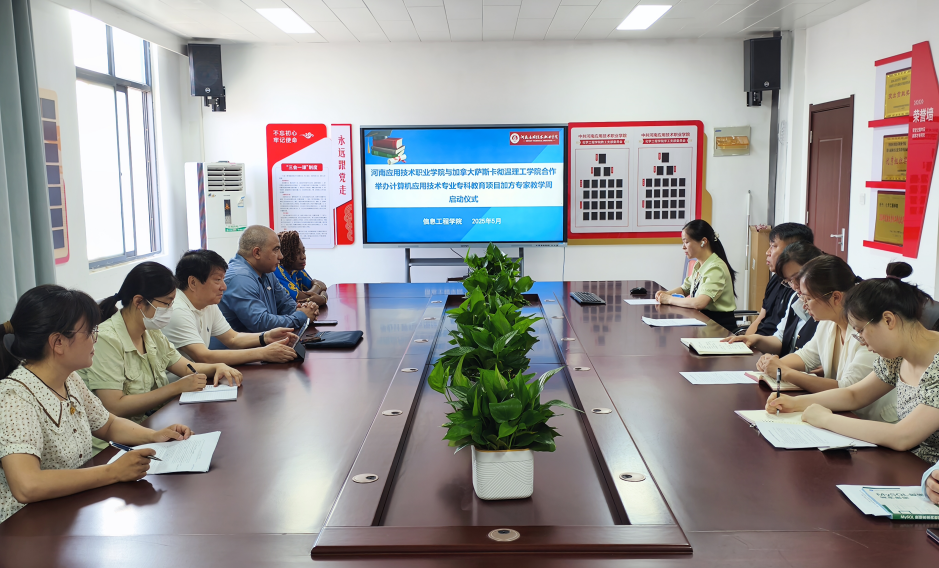 5月19日,河南应用技术职业学院在行政楼512会议室举行了与加拿大萨斯卡彻温理工学院合作计算机应用技术专业专科教育项目加方专家教学周启动仪式。本次会议由副院长夏丽珍主持,参与仪式的有中加国际合作项目主任、项目管理委员会管理专员Bruce Yu,来自加拿大的外教团队Mrs.Ada Ajunwa和Mr.Hazem Youssef老师、科研外事处游渊副处长、信息工程学院党总支书记崔琳、学院院长王雷,语言助教老师李改玲,学院教师代表曲宏阳与学生代表。
