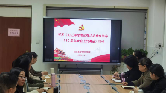 根据校党委工作安排,以习近平新时代中国特色社会主义思想为指导,深入学习贯彻《习近平总书记在纪念辛亥革命110周年大会上的重要讲话精神》和《关于推动现在职业教育高质量发展的意见》,2021年11月2日下午,信息工程学院党总支组织全体专兼职教师,辅导员等,分别于西校区E414机房和东校区519机房进行学习活动。此次活动,由信息工程学院党总支书记楚斌主持。