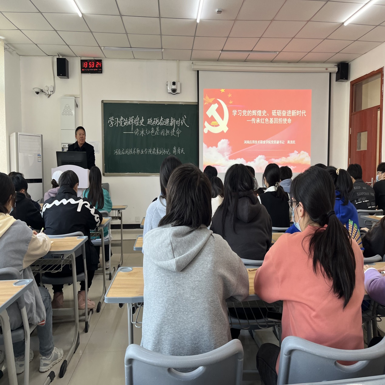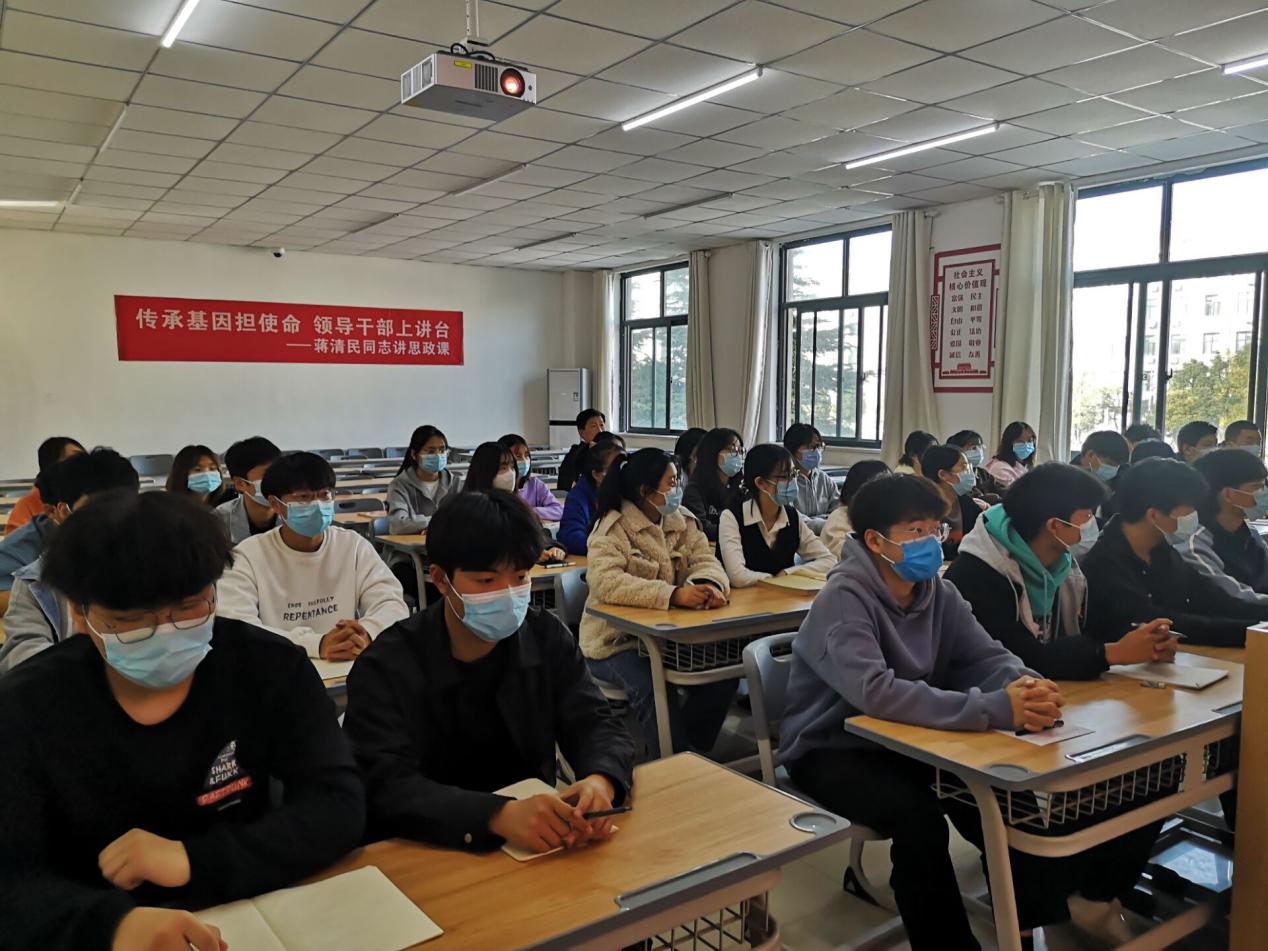 为了进一步深化党史学习教育,2021年11月18日下午两点在双创教学楼206教室,校党委副书记蒋清民同志到所联系的信息工程学院,为大数据2101班学生讲授了一堂“学习党的辉煌史、砥砺奋进新时代----传承红色基因担使命”思想政治课。