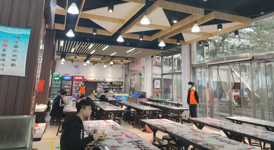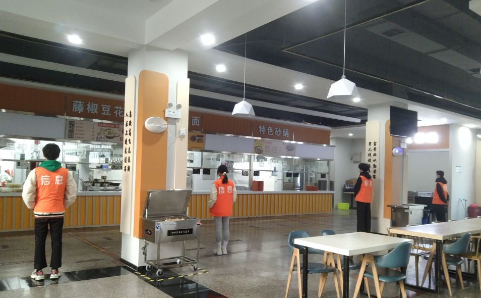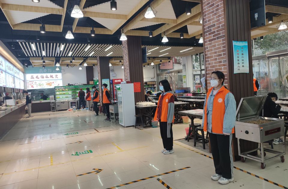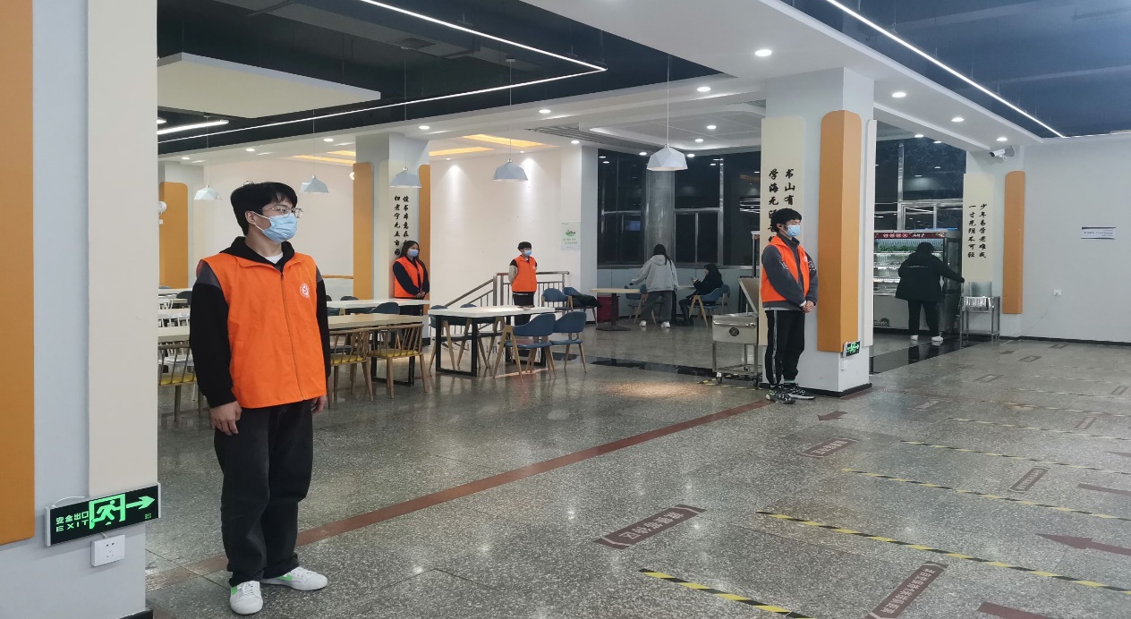 执勤期间,我院学生会成员穿着橙色马甲,分别在三个餐厅的各个用餐地点负责协助食堂人员进行管理,对用餐秩序进行维持,同时对一些不文明现象进行制止,确保食堂就餐环境文明有序,并严格按照规定在协助管理期间佩戴口罩,保持适当距离,牢记防疫宗旨。