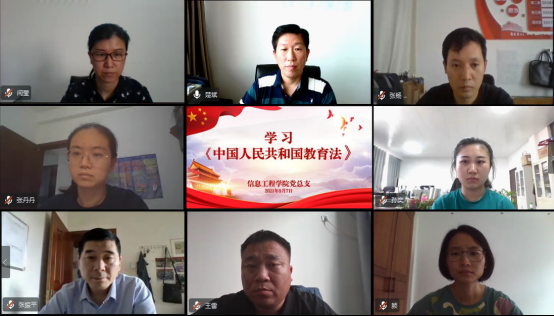 为做好新修订的教育法的学习宣传和贯彻落实工作,信息工程学院党组织于2021年9月7日开展《中华人民共和国教育法(2021修订)》网上专题学习研讨,了解《教育法》修订的背景,重点学习《教育法》修订的主要内容。会议由信息工程学院党总支书记楚斌主持。