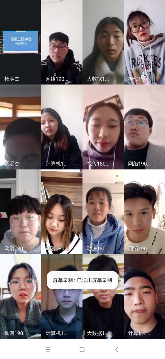 为进一步加强意识形态主阵地建设、深入了解学生思想政治状况。信息工程学院于4月12日下午通过QQ视频开展线上“2020年学生思想政治状况座谈会”。本次会议由信息工程学院党总支副书记杨明杰主持,参加本次线上会议的成员有:信息工程学院团总支书记赵源老师及18、19级各班班干和团干。