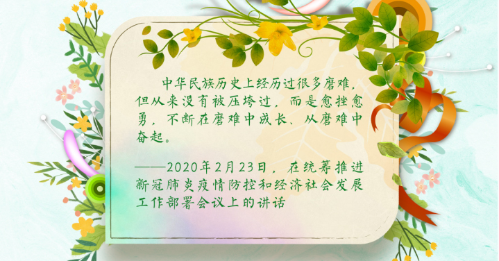 只有奋斗的人生才称得上幸福的人生,也只有奋斗的民族才能克服一切艰难困苦,实现伟大梦想。今年的新冠肺炎疫情不仅是对国家治理体系和治理能力的一次大考,同时也是对全体中国人民的一次大考。习近平总书记说:“中华民族历史上经历过很多磨难,但从来没有被压垮过,而是愈挫愈勇,不断在磨难中成长、从磨难中奋起。”