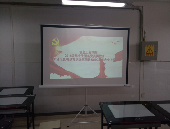为了弘扬五四精神,激发青年人奋发有为、为实现中华民族伟大复兴的中国梦而奋斗。信息工程学院党总支于2019年6月11日在E403组织2016级毕业生预备党员再教育-学习习近平总书记在纪念五四运动100周年大会上讲话,此次会议由信息工程学院党总支书记杨明杰主持。