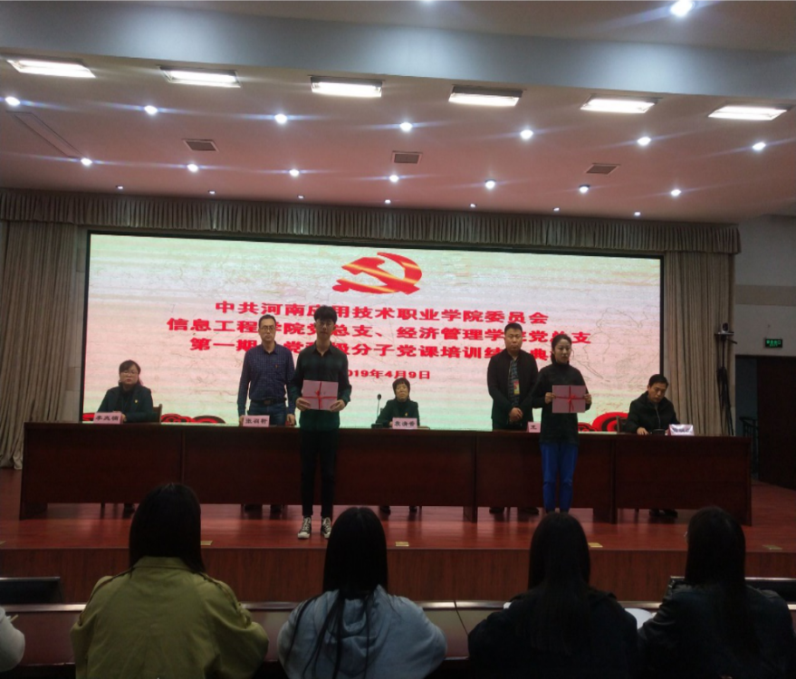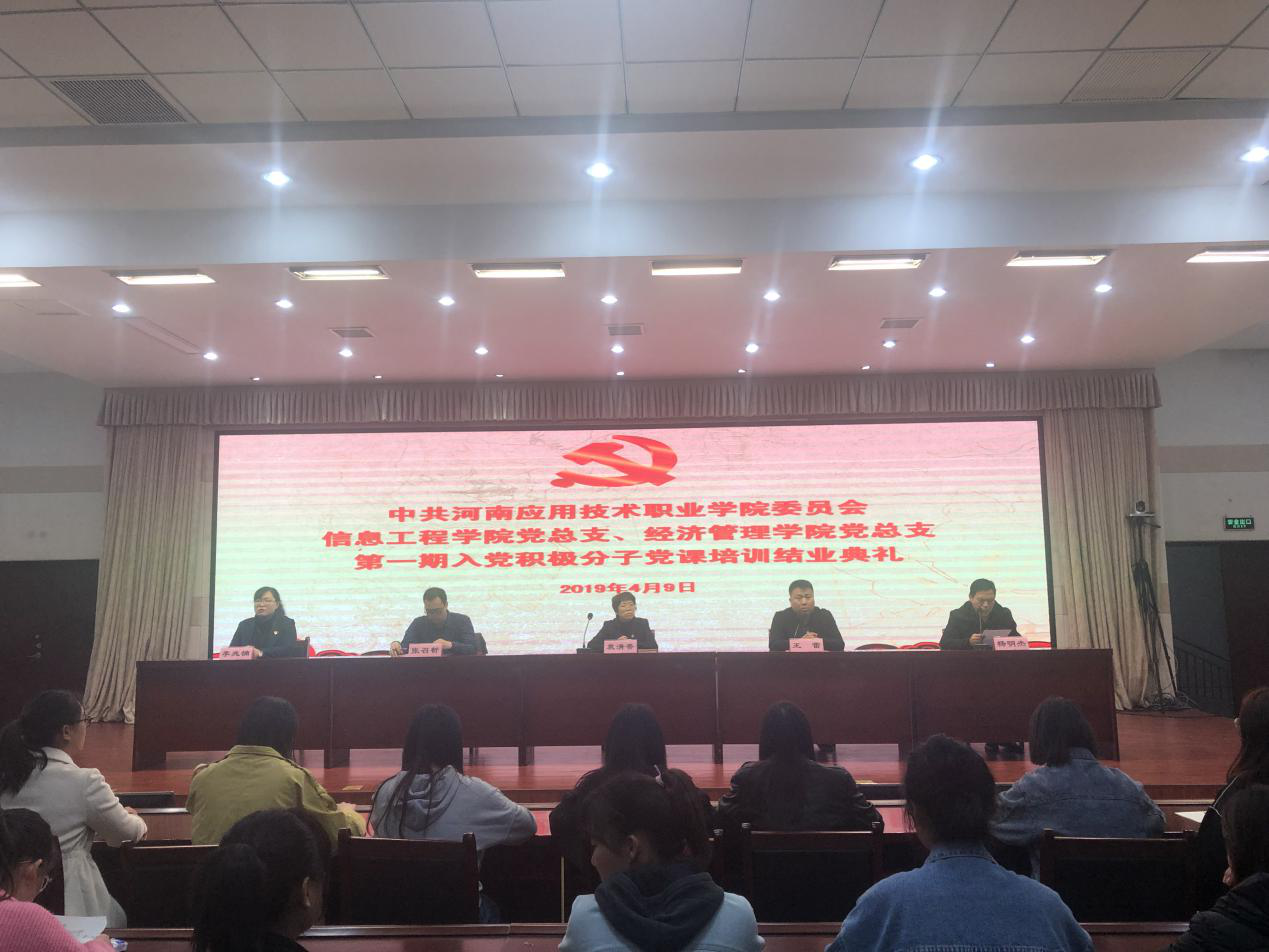 为引导入党积极分子严格以党员的标准要求自己,并坚定自我理想信念,不忘入党初心,继续前行。2019年4月9日14点,信息工程学院党总支联合经济管理学院党总支在实训楼二楼会议室开展了入党积极分子培训结业典礼。本次结业典礼由经济管理学院党总支书记袁清香老师、信息工程学院院长王雷老师、经济管理学院院长张召哲老师、信息工程学院党总支副书记杨明杰老师、经济管理学院党总支副书记李兆楠老师及全体顺利结业的120名入党积极分子参加。