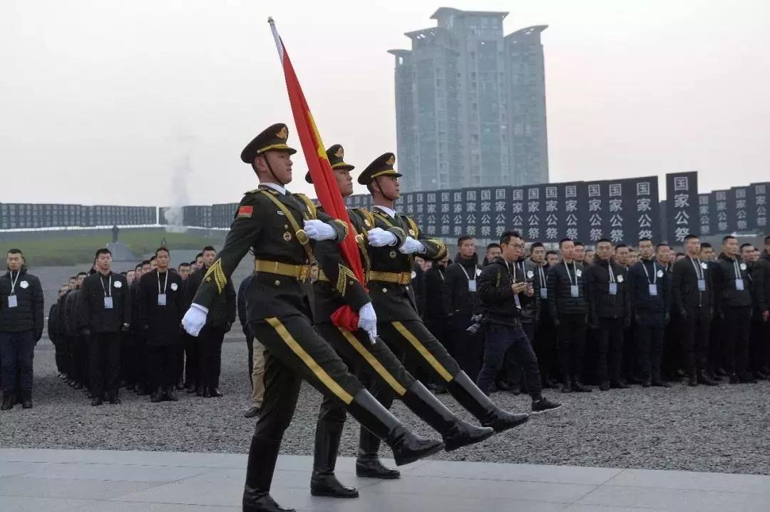 默哀毕,在军乐团演奏的《国家公祭献曲》的旋律中,解放军仪仗大队礼兵将8个花圈敬献于公祭台上。