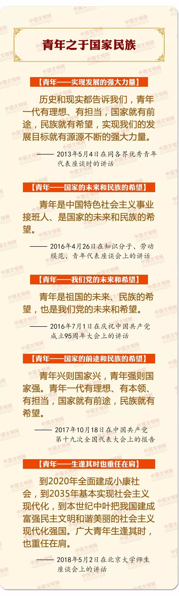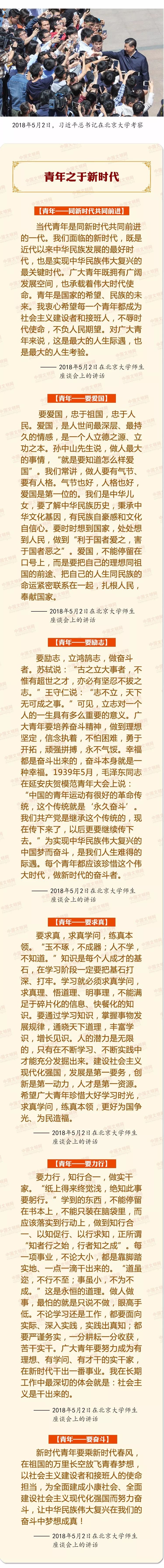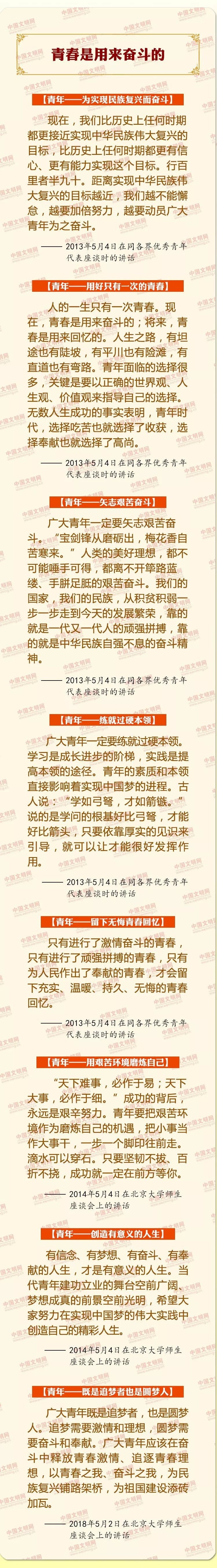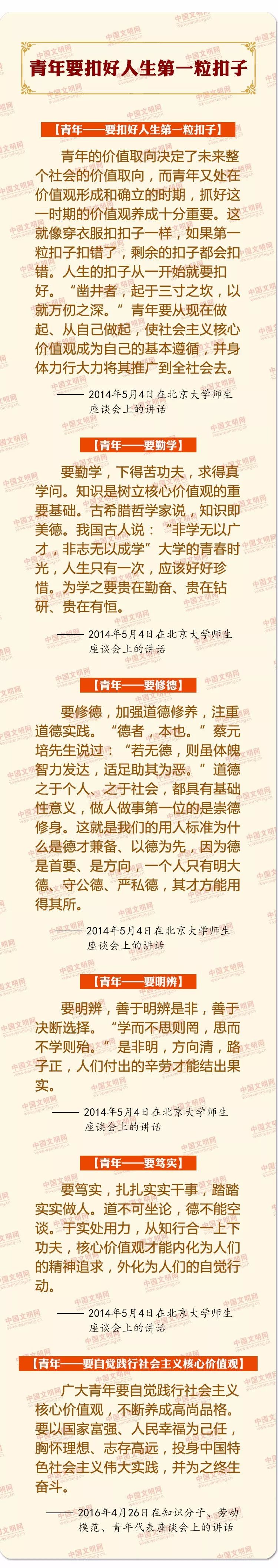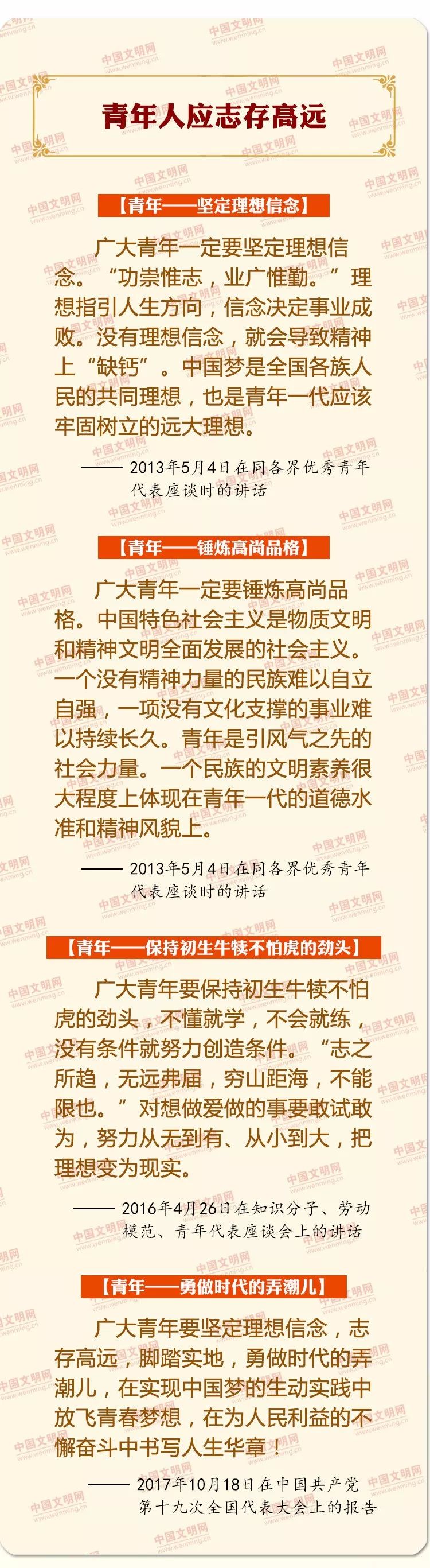 中国梦是历史的、现实的,也是未来的。中华民族伟大复兴的中国梦终将在一代代青年的接力奋斗中变为现实。习近平总书记曾在多个重要场合对青年有过殷切寄语、谆谆教诲。在五四青年节来临之际,中国文明网精选摘编部分重要论述,与广大网友一起学习、共同进步。