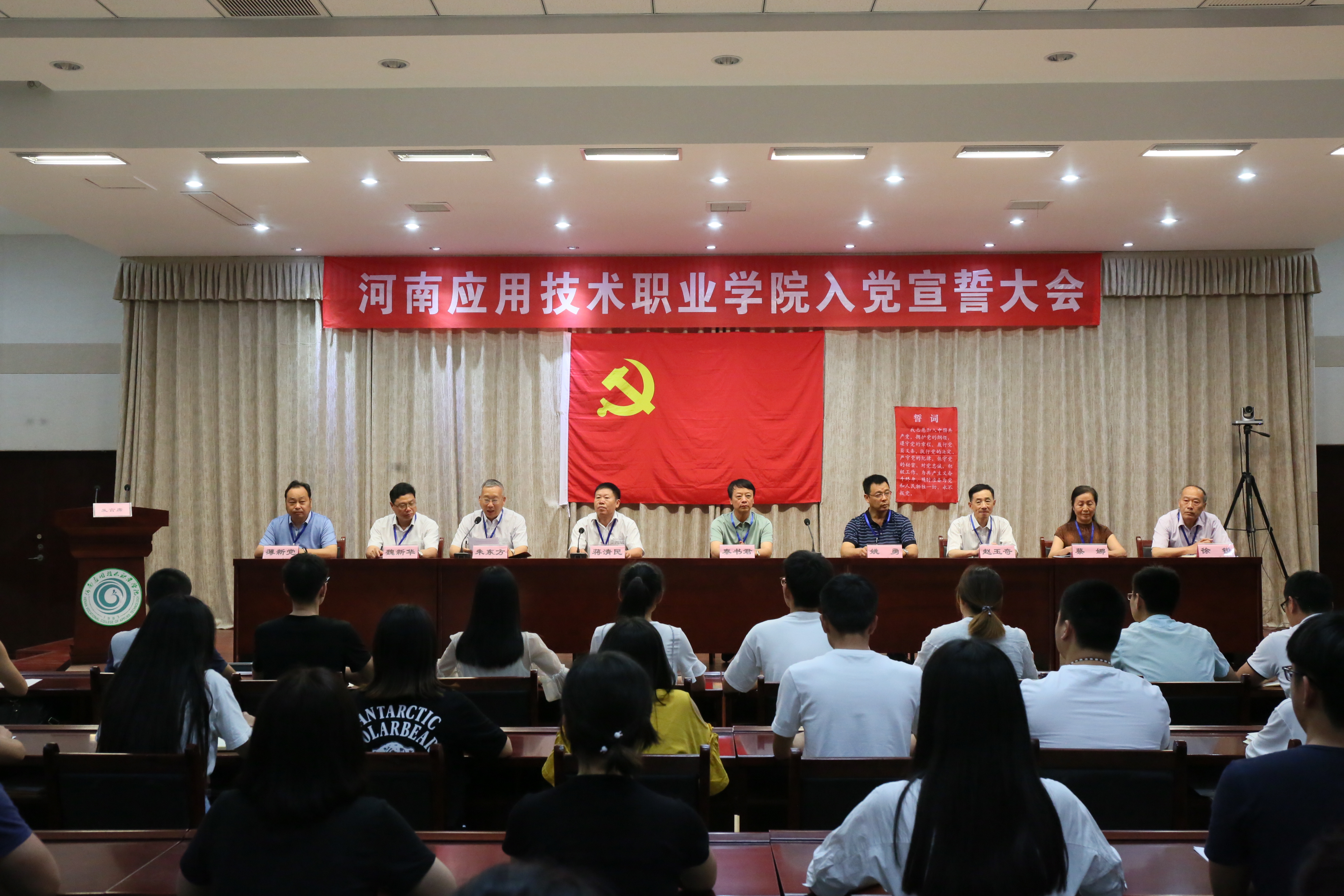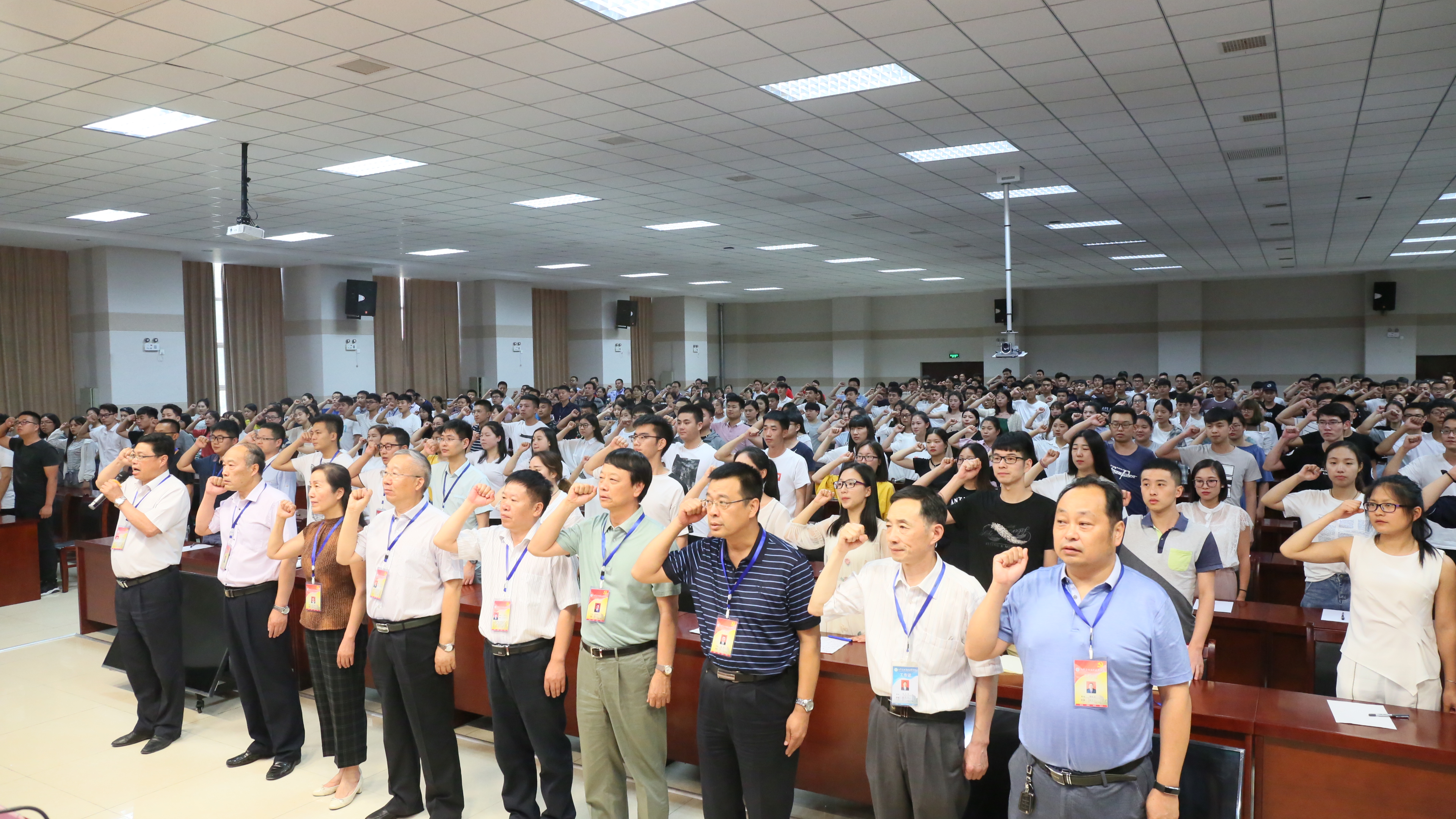 为进一步学习贯彻习近平新时代中国特色社会主义思想,引导党员领导干部不忘初心、牢记使命,6月11日下午,我校在实训中心二楼会议室隆重举行了2018年入党宣誓大会,党委书记秦书君、院长姚勇及学校党委委员、党务工作者代表、老党员代表、入党积极分子代表、297名预备党员参加大会。