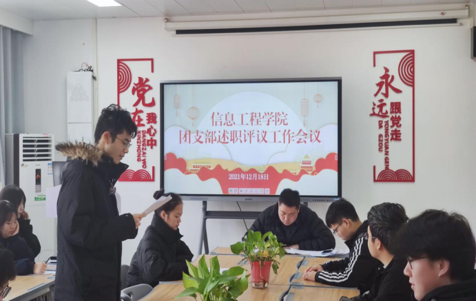 为加强信息工程团支部的自身建设,落实本学年各班级团支书的工作情况,要求各班级团支书为自己本学年在团支部的工作做出简要述职报告。信息工程学院于2021年12月18日上午在党员活动室议室召开本学年第一次团支部述职评议工作会议。本次述职工作评议会议由团总支书记赵源老师召开,其中20级、21级各班团支书分别进行述职。
