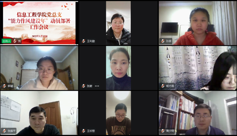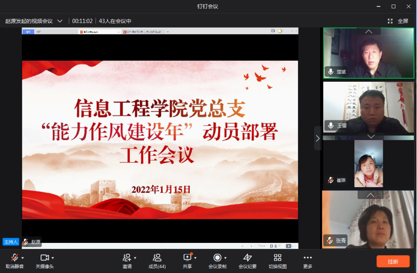 为深入学习贯彻党的十九届六中全会精神,贯彻落实习近平总书记视察河南重要讲话、重要指示,推进我校治理体系和治理能力现代化,动员广大党员干部践行初心使命、强化“答卷”意识,切实把校党委“能力作风建设年”活动部署落实落细,2022年1月15日晚八点,信息工程学院党总支组织全体教师通过钉钉会议平台开展主题党日活动,进行网上集中学习,会议由信息工程学院党总支书记楚斌主持。