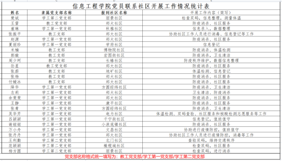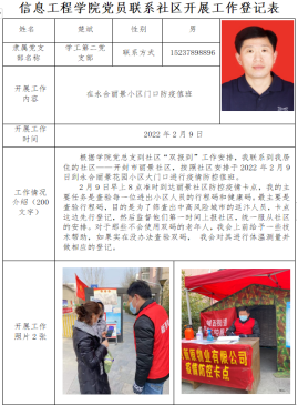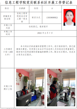信息工程学院党总支全体党员积极落实到社区(村)报告,填写党员联系社区开展工作登记表,建立工作台账,将工作规范化,细致化。党员同志们有的在社区门口进行出入车辆登记,有的积极协助社区工作人员场所消毒,有的负责楼栋整体的防疫卫生把控,有的帮助社区人员进行资料整理,真正做到了多点开花,全面发力,把党员身份亮了出来,把能力体现到了实处。