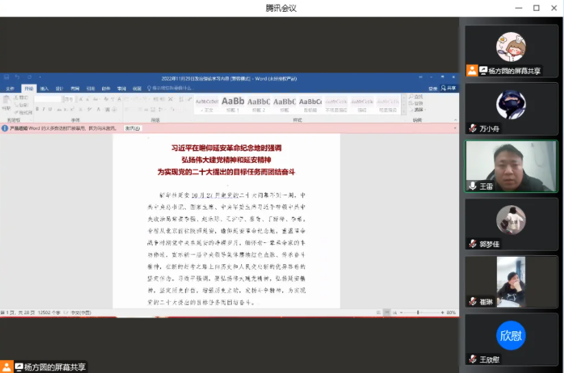崔琳要求全体教师会后自行学习前期下发的2022-2023学年第一学期政治理论学习计划表的内容,并对全体党员教师提出要求,要不忘初心,牢记使命,坚定不移跟党走。大家纷纷表示,作为新时代的教育工作者,要牢记习近平总书记的嘱托,时刻谨记自己教书育人的责任与义务,并表示将切实把思想和行动统一到日常工作中去,培养堪当民族复兴大任的时代新人。