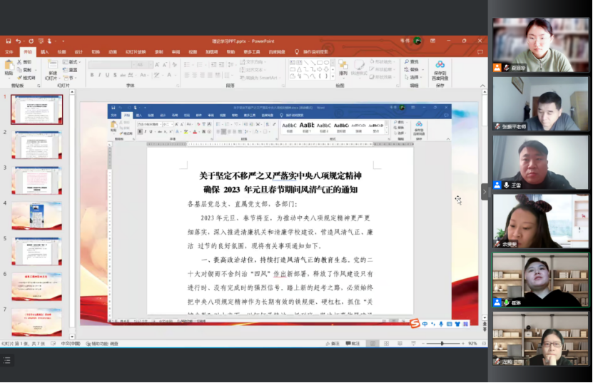 会议第二项,崔琳梳理总结2022年学院党建工作要点及廉政工作落实情况,传达并组织学习学校纪委近期下发的三个重要文件。会议中指出,按照《河南省纪委监委驻省教育厅纪检监察组关于2023年元旦春节期间纠”四风”树新风工作提示》及学校纪委《关于坚定不移严之又严落实中央八项规定精神 确保 2023 年元旦春节期间风清气正的通知》精神,信息工程学院党总支在2022年12月29日、31日组织全体教职工进行了相关文件学习,在2023年1月4日、6日分两次学习了违反中央八项规定典型案例、违反教师职业行为典型案例,并在1月5日采用新媒体形式进行了集体廉政提醒谈话。1月11日上午,组织全体教职工学习《习近平在二十届中央纪委二次全会上发表重要讲话》、2022年《以案释法》第十一辑、2022年《以案释法》第十二辑,崔琳书记再次强调元旦春节既是“人情关”,更是“廉洁关”,要求每一位教职工在元旦春节期间牢记校纪委通知精神,纠四风树新风,过一个廉洁祥和文明的假期。