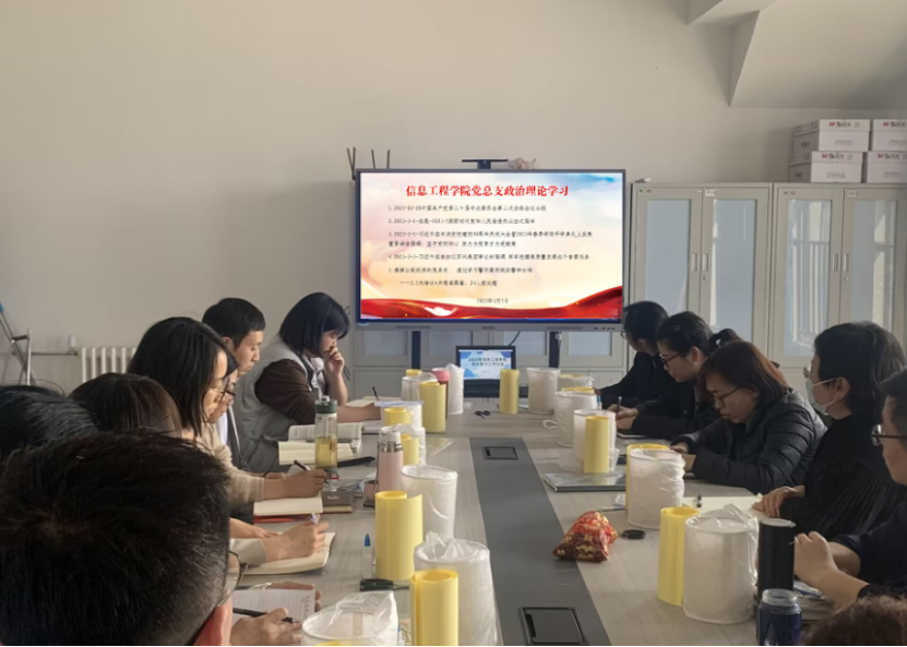 为了深入学习贯彻党的二十大确定的目标任务,筑牢师德师风防线,规范教师队伍建设。2023年3月7日下午2点,信息工程学院党总支组织东西校区全体党员及教职工,在西校区A514、东校区A314会场,以腾讯会议连接,开展政治理论学习活动,集中学习了:1.中国共产党第二十届中央委员会第二次全体会议公报;2.求是2023-5期新时代党和人民奋进的必由之路;3.习近平在中央党校建校90周年庆祝大会暨2023年春季学期开学典礼上发表重要讲话强调:坚守党校初心 努力为党育才为党献策;4.习近平在参加江苏代表团审议时强调 牢牢把握高质量发展这个首要任务;5.揭掉公款旅游“隐身衣”。本次党政学习由信息工程学院党总支书记崔琳主持,全体党员及教职工参加会议。