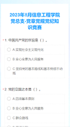 为深入学习宣传贯彻党的二十大精神和习近平新时代中国特色社会主义思想,教育引导学院广大党员自觉学习党章、遵守党章、贯彻党章、维护党章,统一党员和干部的思想,把力量凝聚到党的二十大提出的各项任务上来。2023年8月20日,信息工程学院党总支开展了党章党规党纪知识竞赛活动。