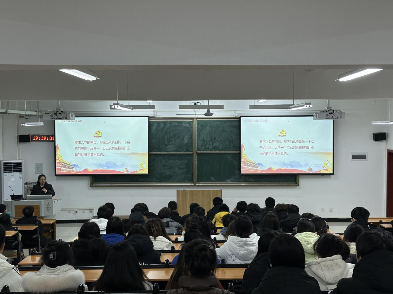为切实加强入党积极分子队伍建设,提高入党积极分子的思想觉悟,进一步加强入党积极分子对党的基本理论知识系统学习,确保新党员的发展质量,信息工程学院党总支于2023年12月23日在开封校区A401开展了“坚定理想信念,端正入党动机”专题党课,信息工程学院团总支书记冷月主讲,22级全体入党积极分子参与学习 。