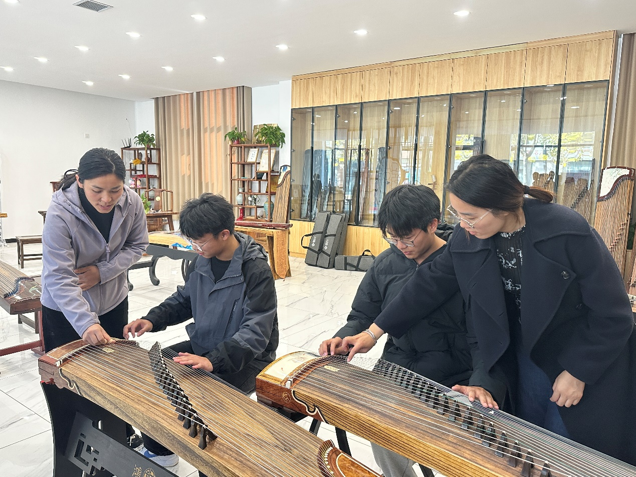 活动过程中,琴社负责人带领同学们到达多个斫琴展览室,并详细地向同学们介绍了多把琴的制作工艺流程。在不同展览室内,同学们也第一次有机会近距离接触古典乐器,了解其制作背景。当到达体验区时,更是按耐不住自己激动的心情,“击鼓、抚琴、敲磬”,沉浸式体验了一把文人雅士的志趣!为使同学们体验感更深刻,互动交流环节,基地老师更是亲自俯身,演奏琴曲。为同学们带来了一堂生动的古琴艺术鉴赏课,让学生“零距离”感受中华传统文化的别样魅力!