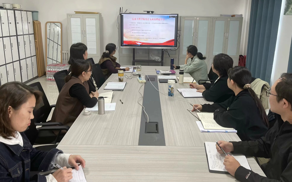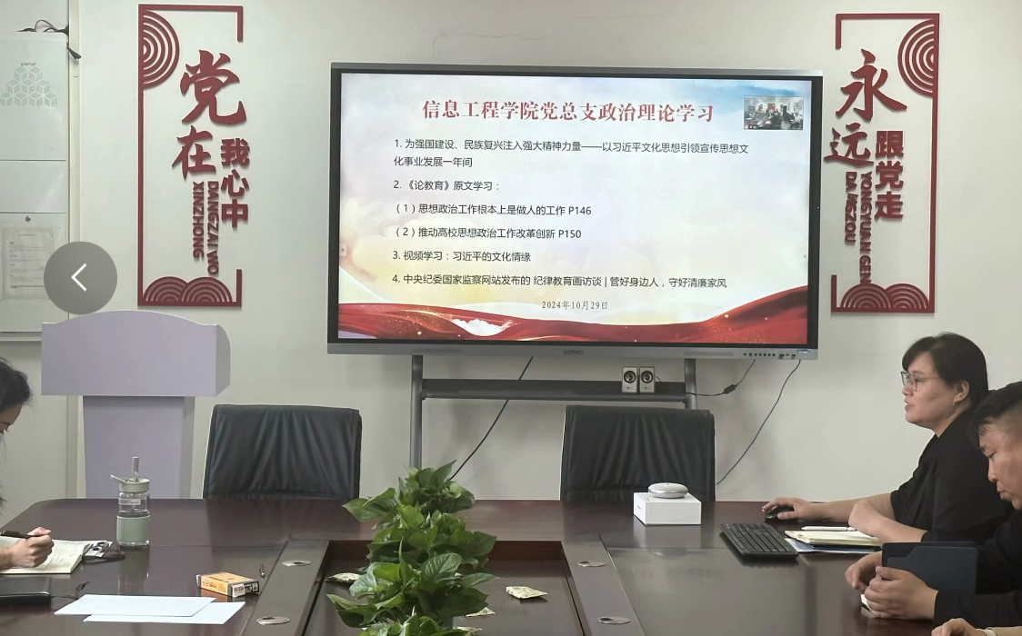 2024年10月29日,信息工程学院党总支组织郑州、开封两校区全体党员及教职工,在郑州校区A514、开封校区北院F314以腾讯会议视频连接形式,开展政治理论学习活动。本次学习活动由信息工程学院党总支书记崔琳主持,全体党员及教职工参加会议。主要学习内容有:1.为强国建设、民族复兴注入强大精神力量——以习近平文化思想引领宣传思想文化事业发展一年间;2.《论教育》原文学习:(1)思想政治工作根本上是做人的工作(2)推动高校思想政治工作改革创新3.视频学习:习近平的文化情缘4.中央纪委国家监委网站发布的 纪律教育画访谈 | 管好身边人,守好清廉家风。