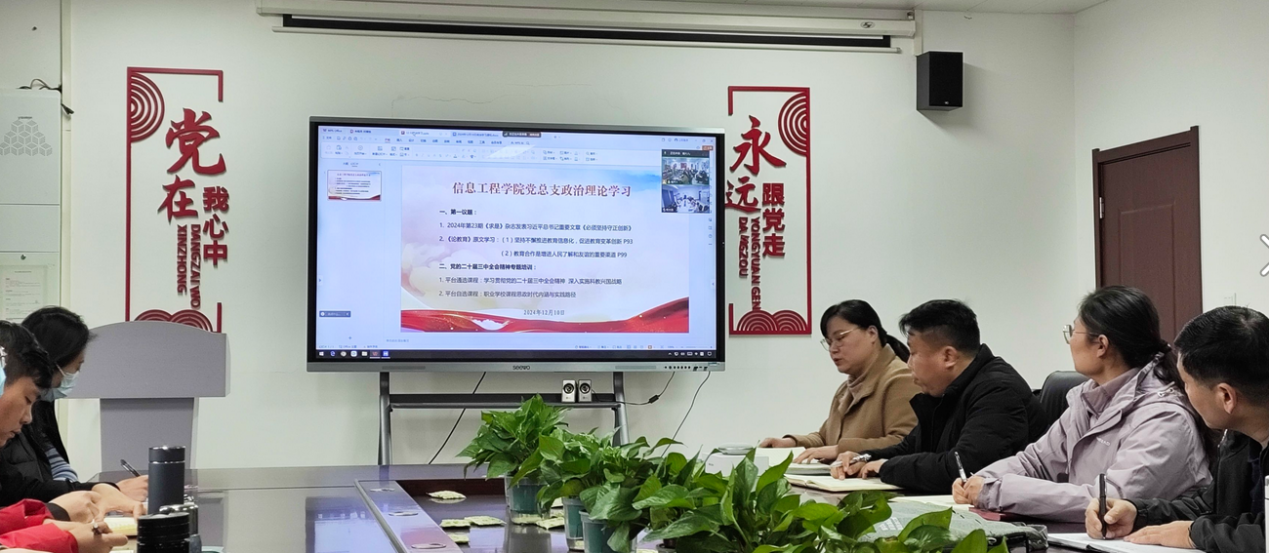2024年12月10日,信息工程学院党总支组织全体党员及教职工,在郑州校区A517、开封校区F314以会议视频形式,开展政治理论学习活动。本次学习活动由信息工程学院党总支书记崔琳主持,全体党员及教职工参加学习活动。主要学习内容有:一、第一议题:1. 2024年第23期《求是》杂志发表习近平总书记重要文章《必须坚持守正创新》2. 《论教育》原文学习:(1)坚持不懈推进教育信息化,促进教育变革创新;(2)教育合作是增进人民了解和友谊的重要渠道;二、党的二十届三中全会精神专题培训:(1)平台通选课程:学习贯彻党的二十届三中全会精神 深入实施科教兴国战略(2)平台自选课程:职业学校课程思政时代内涵与实践路径。