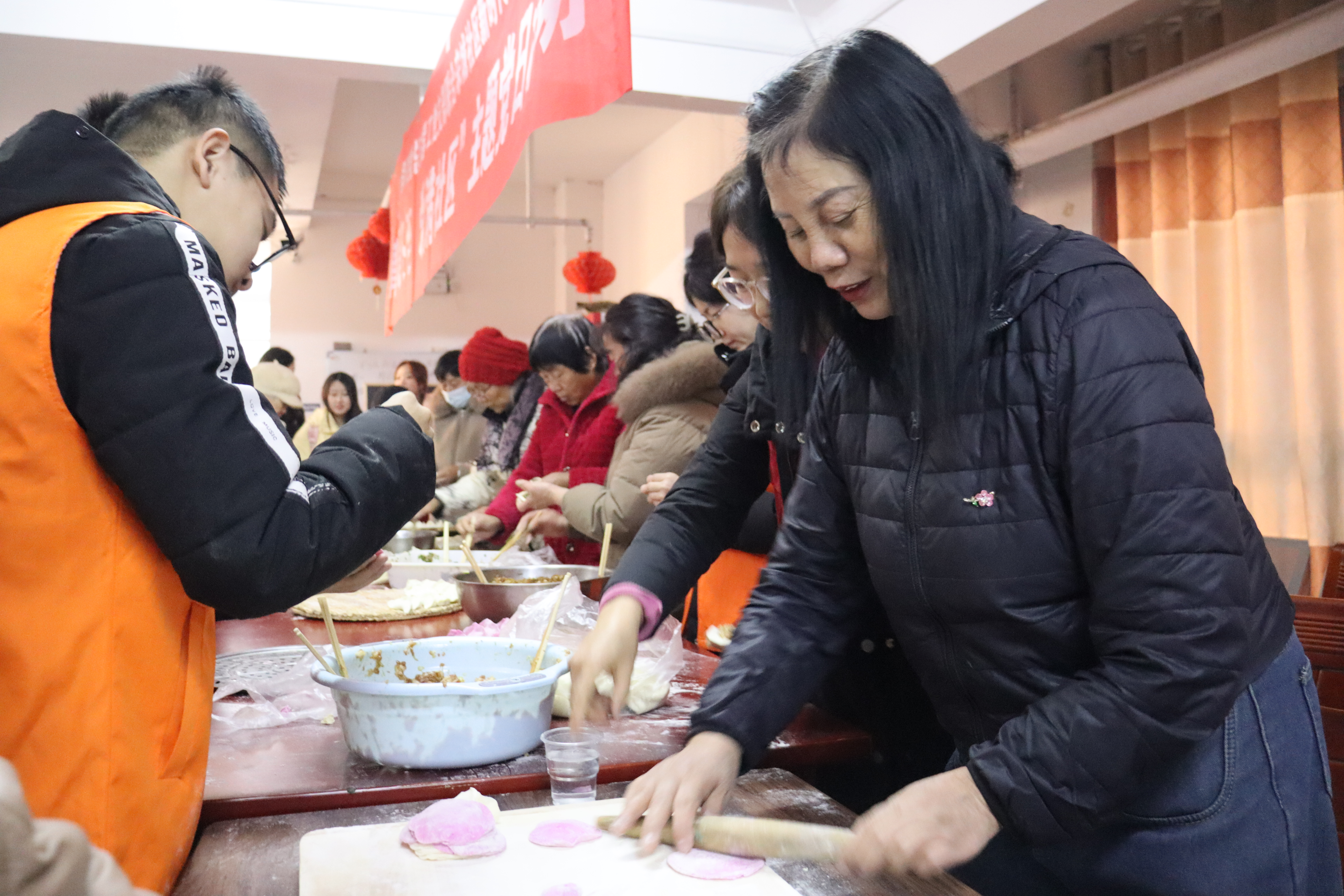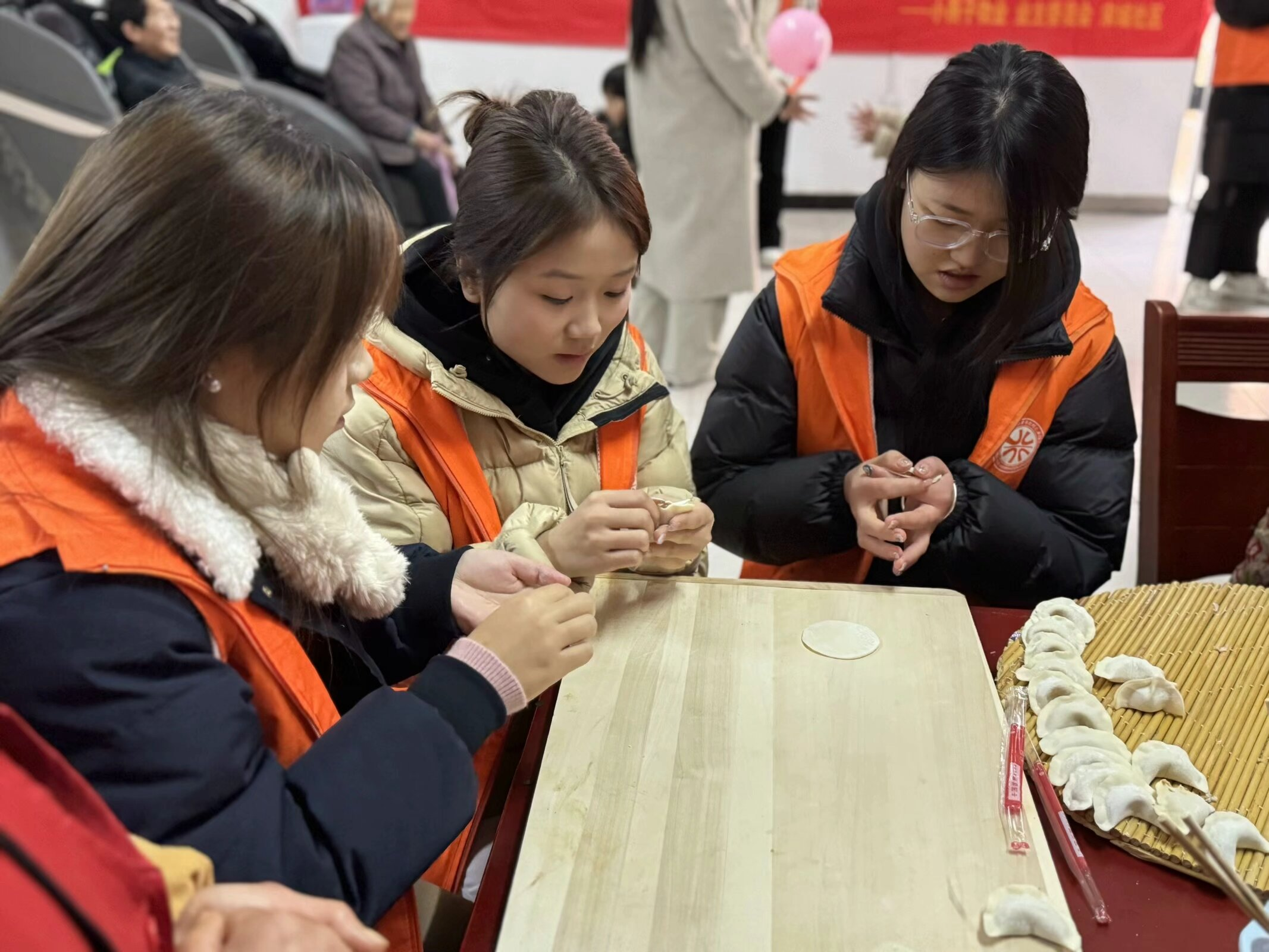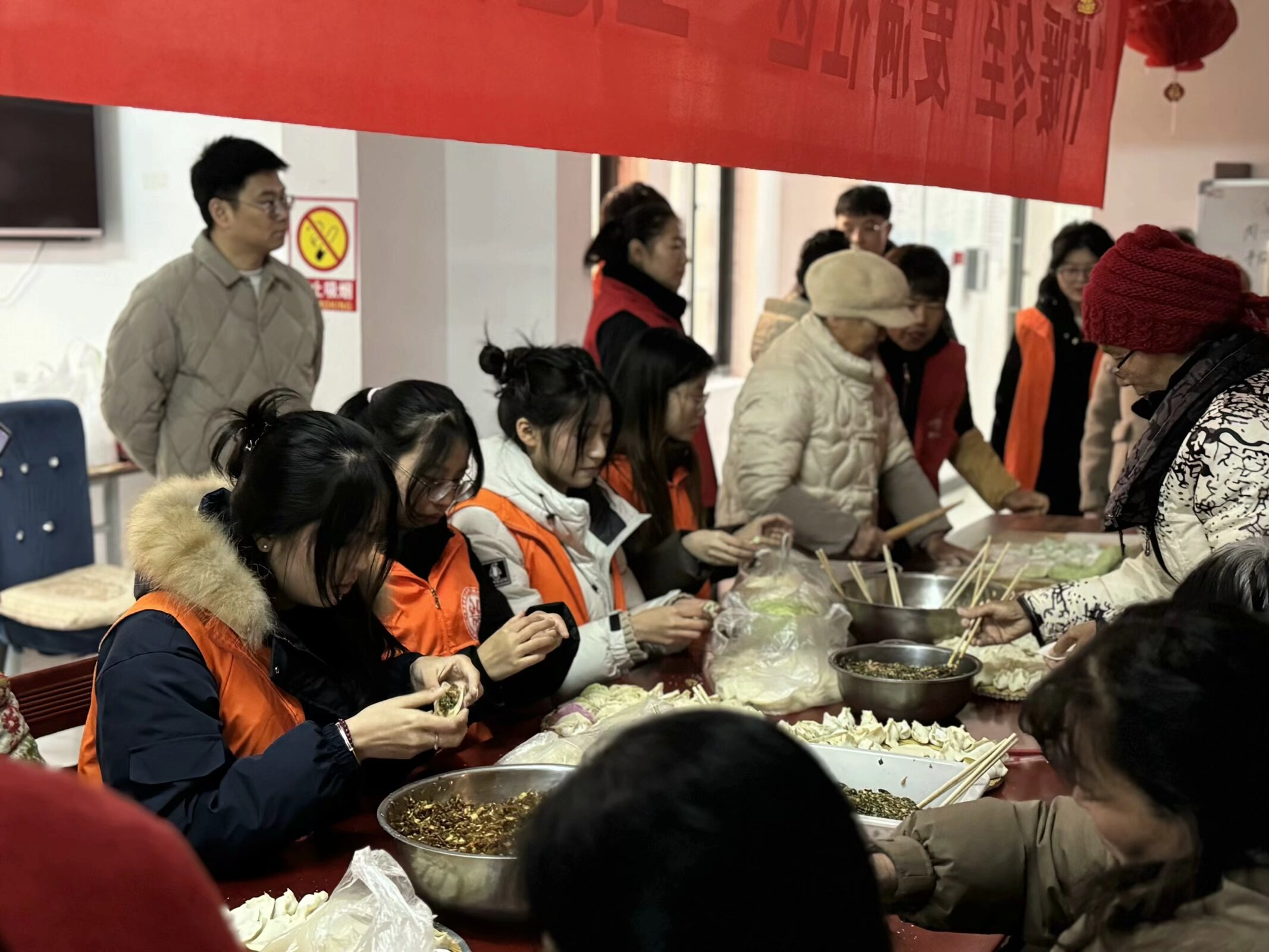 活动当天,我院青年与社区工作人员、居民一起分工协作,一手拿起饺子皮,一手填馅,双手合拢一捏,一个个形态各异的饺子就成型了。