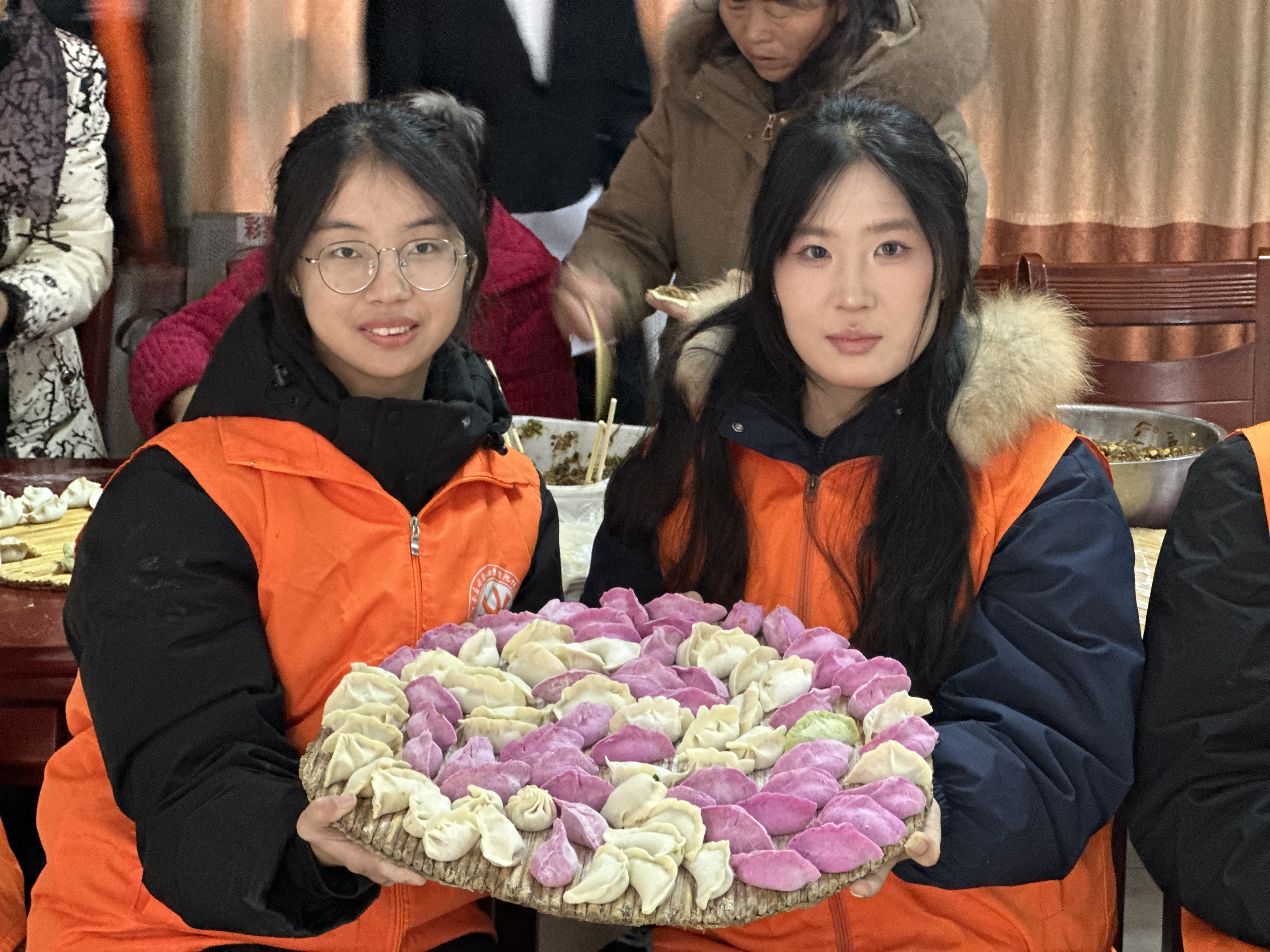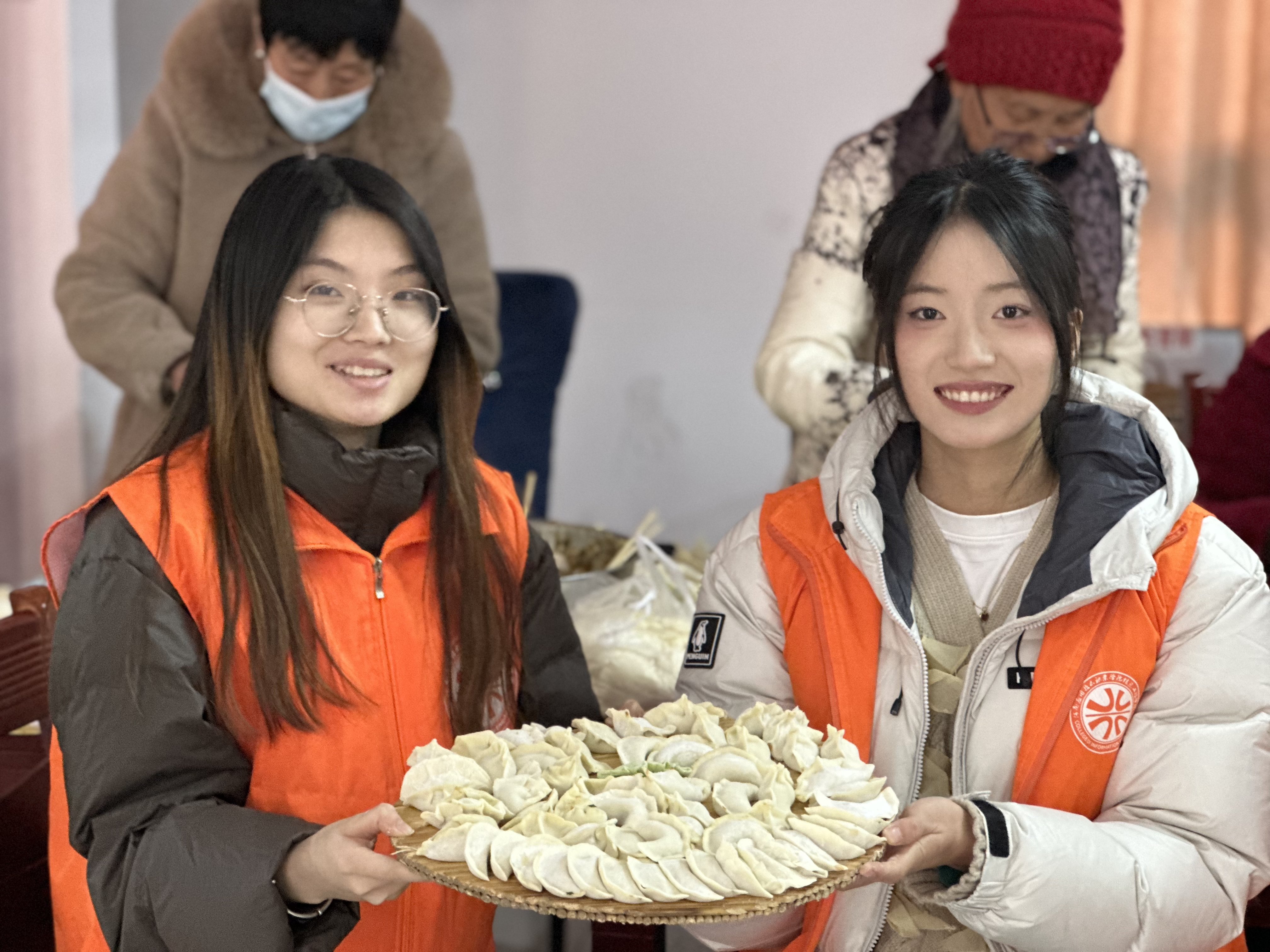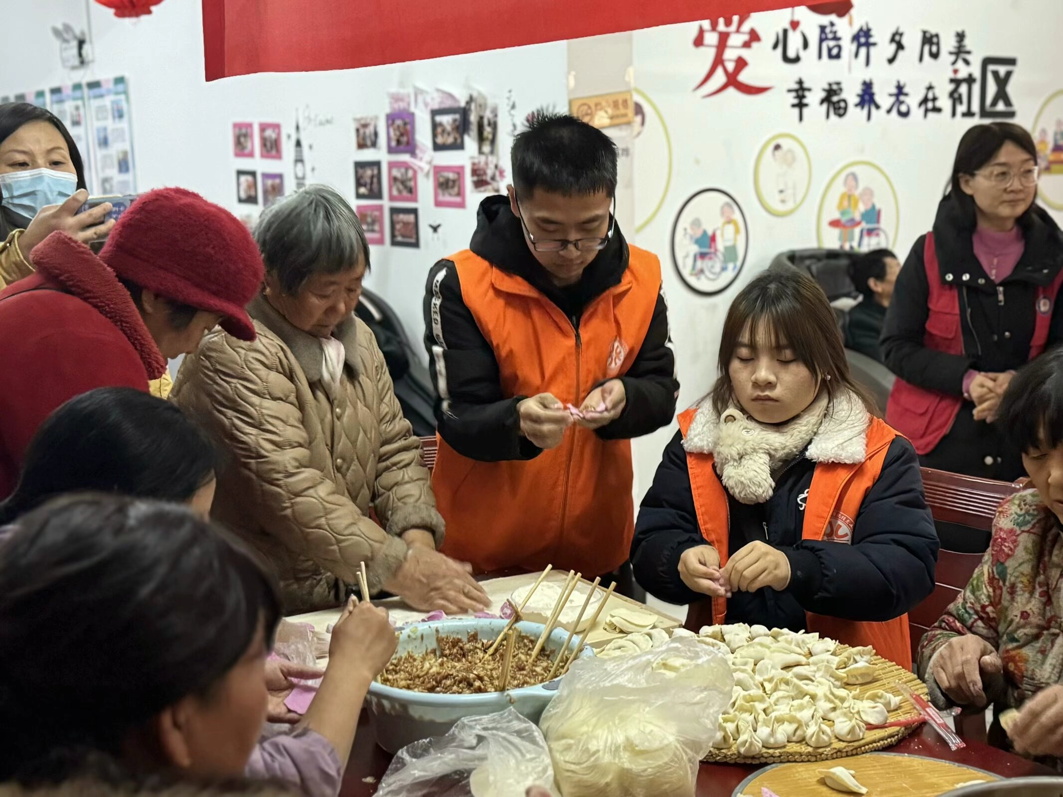 活动当天,我院青年与社区工作人员、居民一起分工协作,一手拿起饺子皮,一手填馅,双手合拢一捏,一个个形态各异的饺子就成型了。