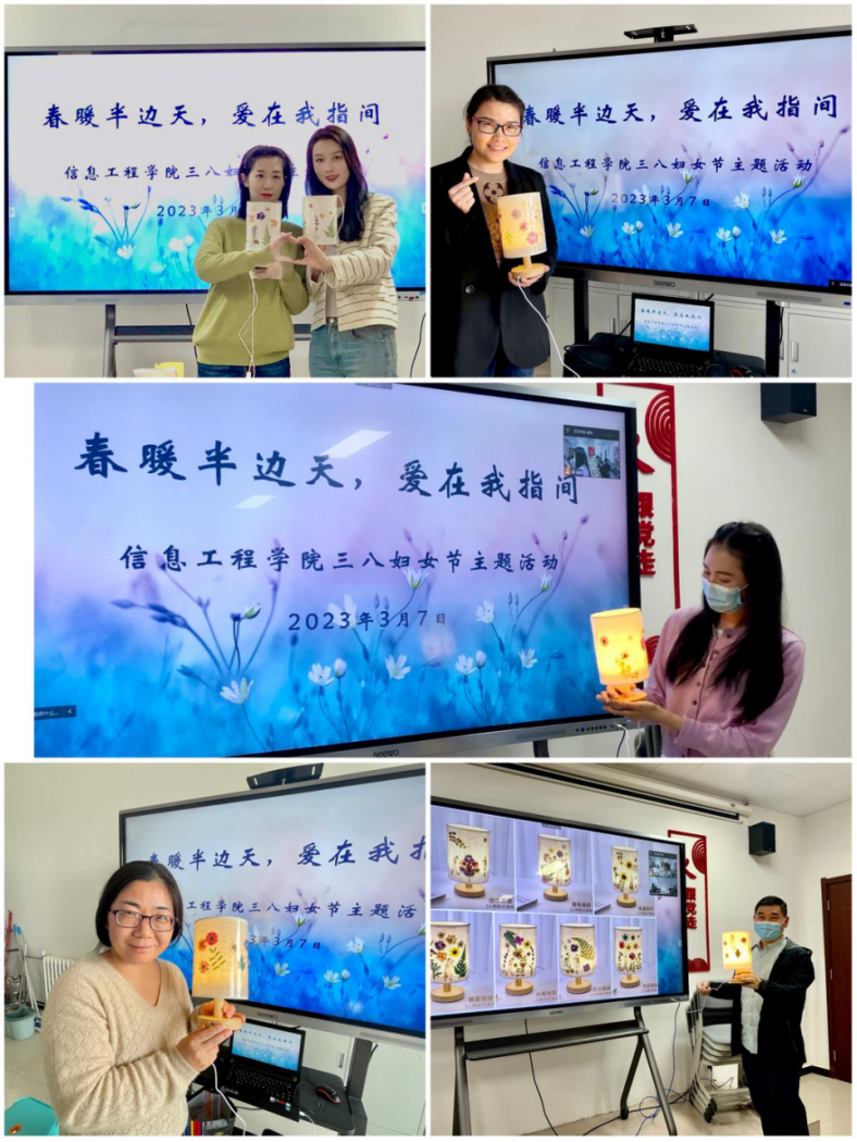 三月是春意与浪漫共存的日子,教师是点亮心灵的职业。为庆祝三八国际妇女节到来,更好地展现信息工程学院女教职工风采,同时关爱和答谢女教职工辛勤努力为信息工程学院做出的贡献,进一步激发工作热情和创造力,提升组织凝聚力,信息工程学院于3月7日下午分别在东、西校区同时开展“春暖半边天,爱在我指间”三八妇女节压花台灯DIY活动。
