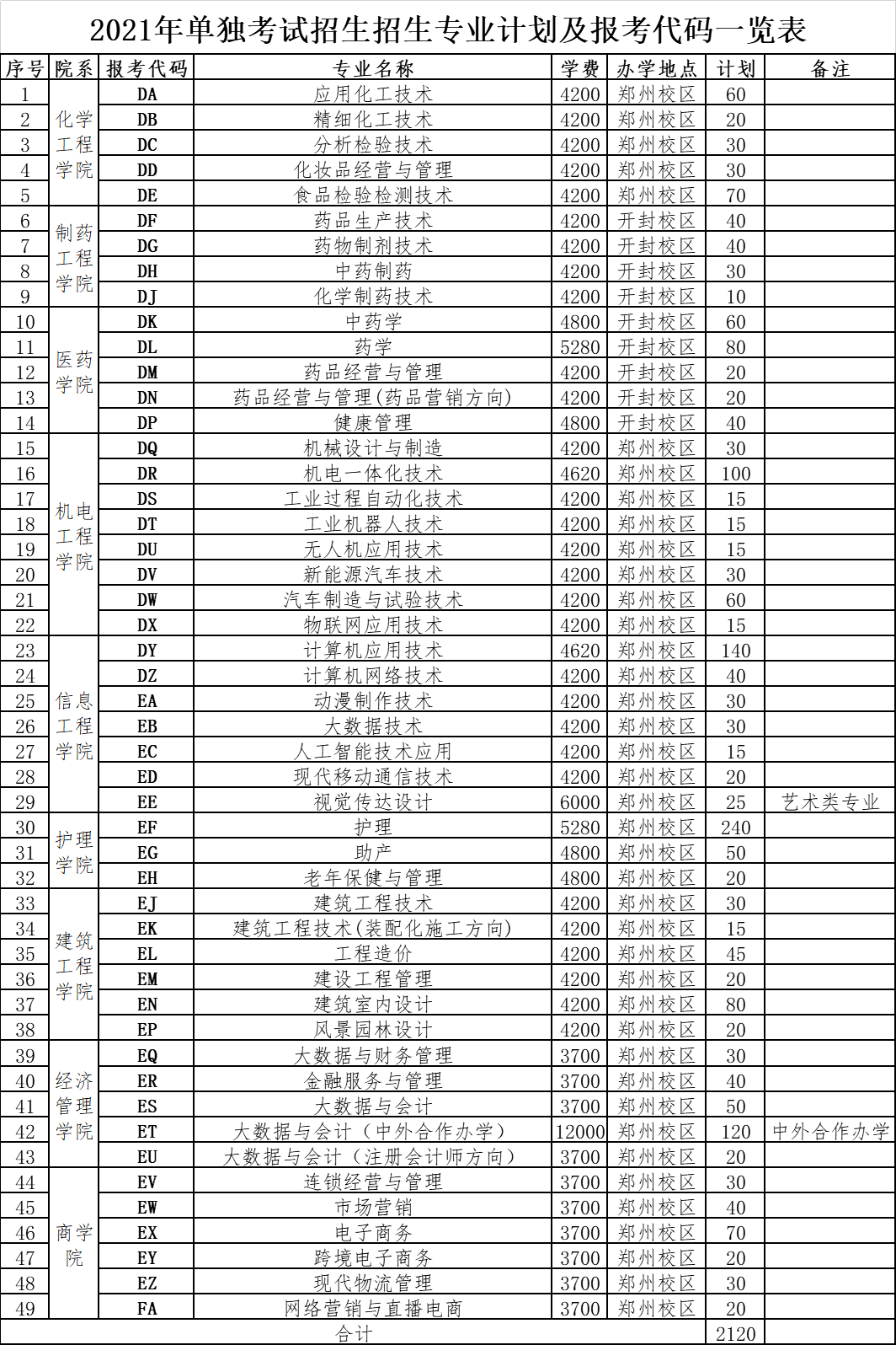 2021年单独考试招生专业计划及报考代码一览表