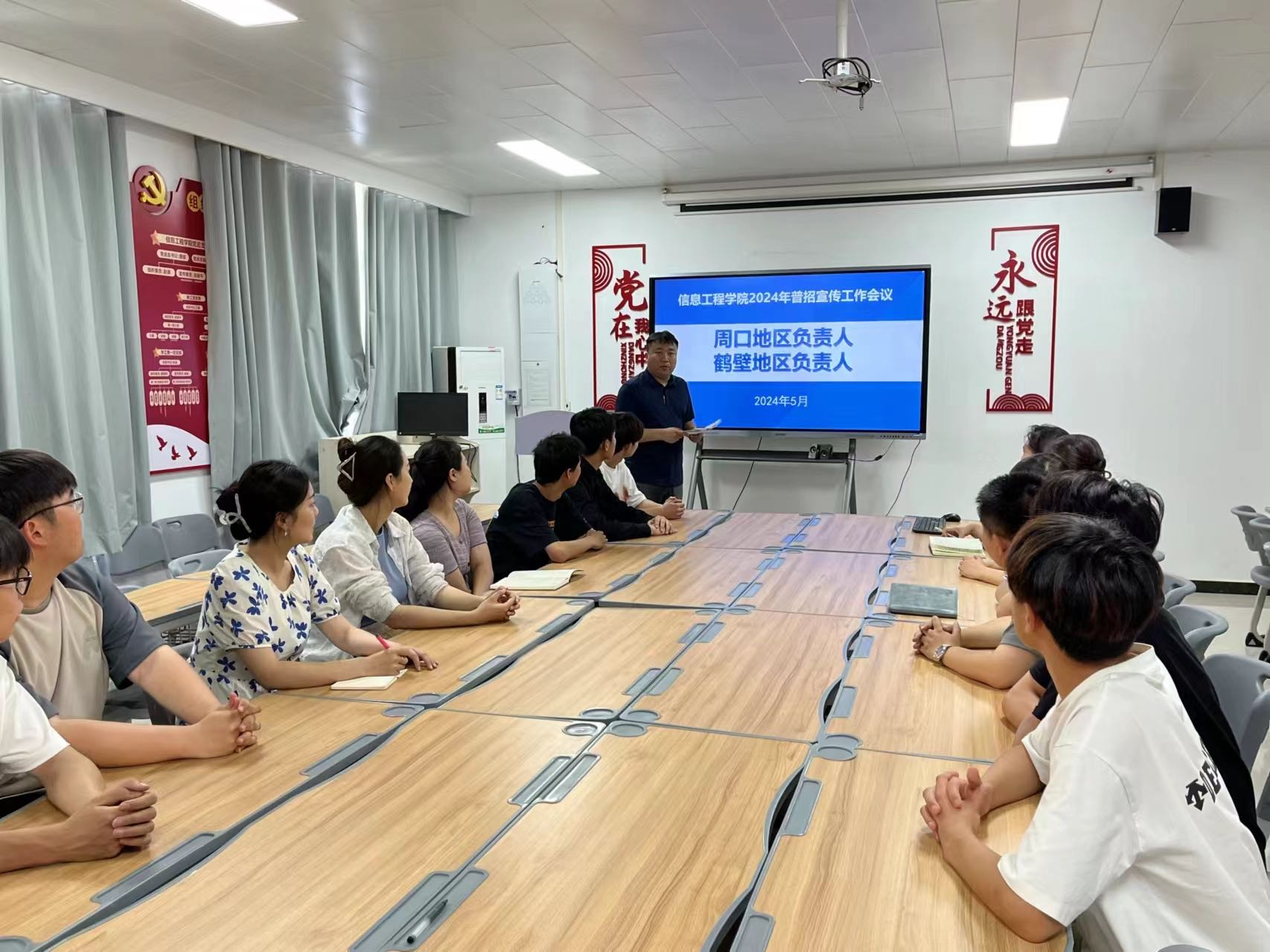 5月28日下午信息工程学院在郑州校区A514会议室、开封校区C314会议室召开2024年社会实践学生(普招)招生宣传工作动员会。信息工程学院院长王雷、书记崔琳、副院长齐峰、副院长夏丽珍、副书记蒋欣哲、负责招生的老师和社会实践学生参加会议。会议由学工办主任常昆 。