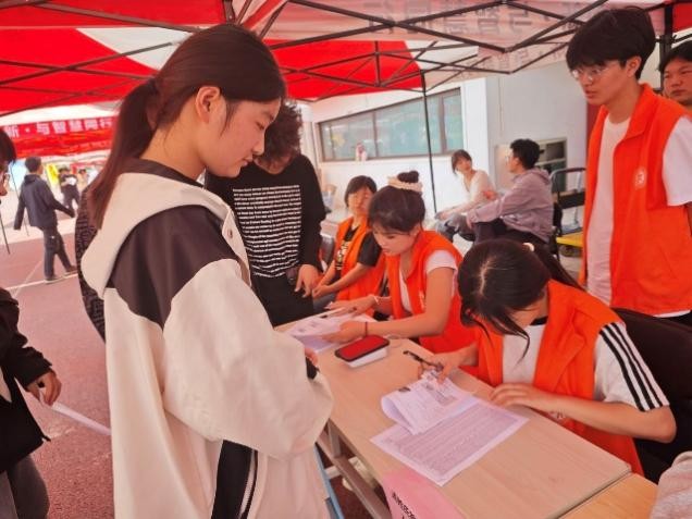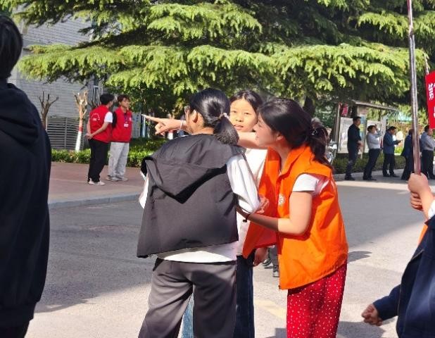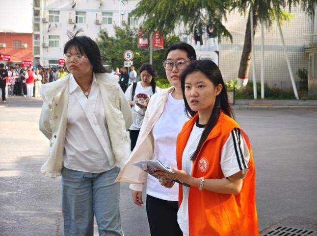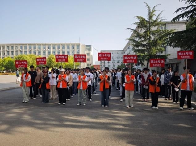 考生们一个个精神抖擞,眼神里闪烁着自信的光芒,排着整齐的队伍,奔赴战场。志愿者们穿着亮眼的马甲,在人群里来回穿梭,指引方向、解答问题。
