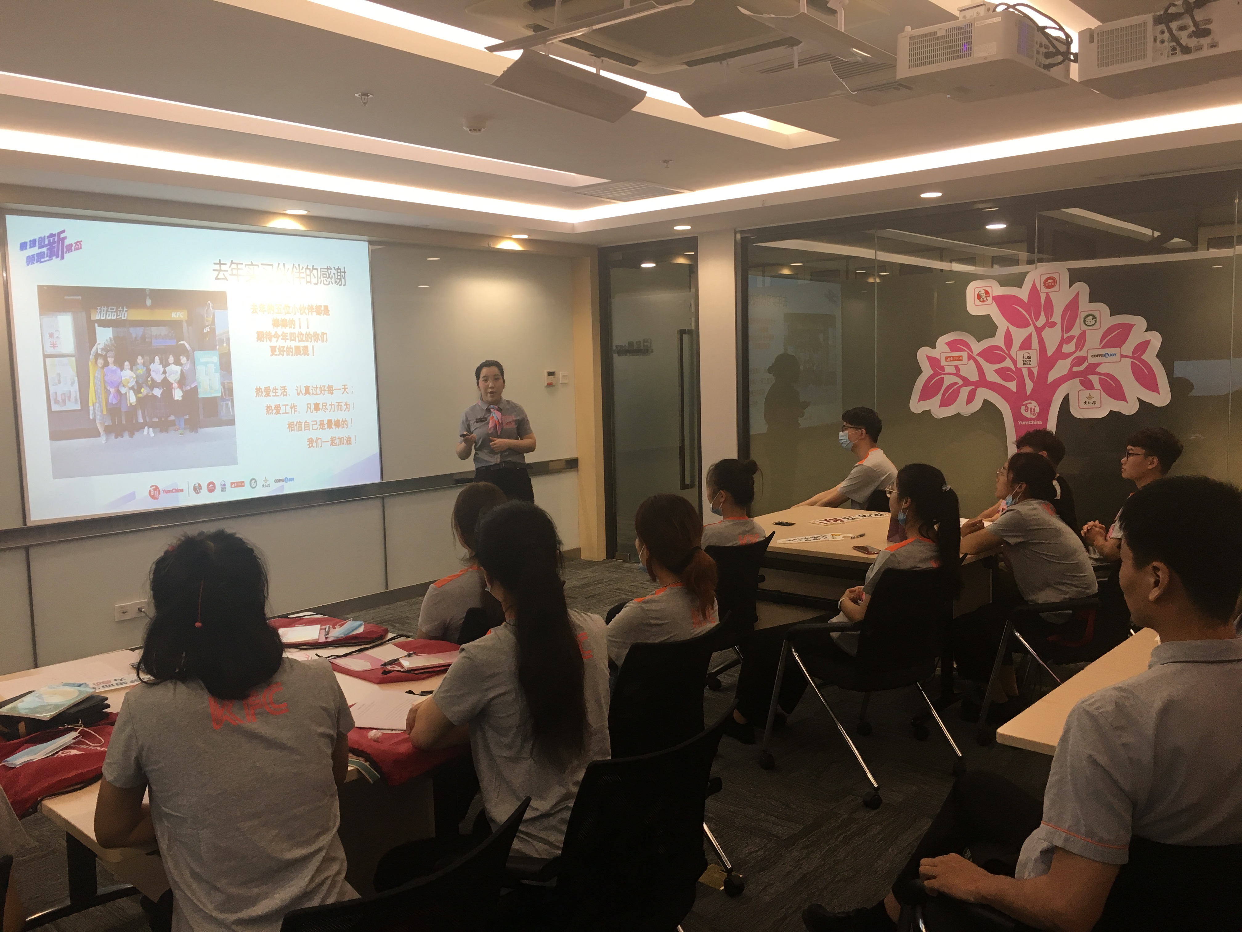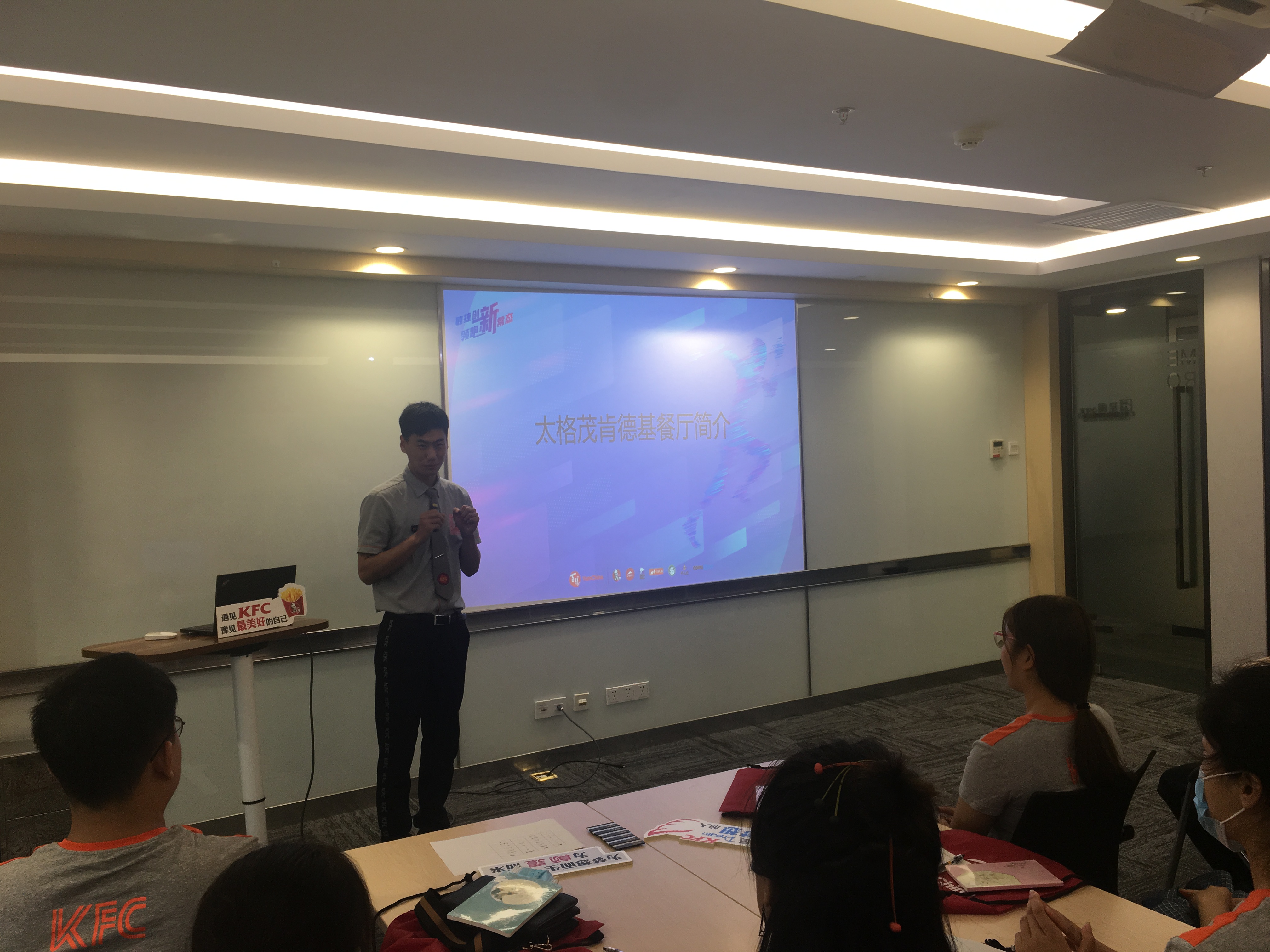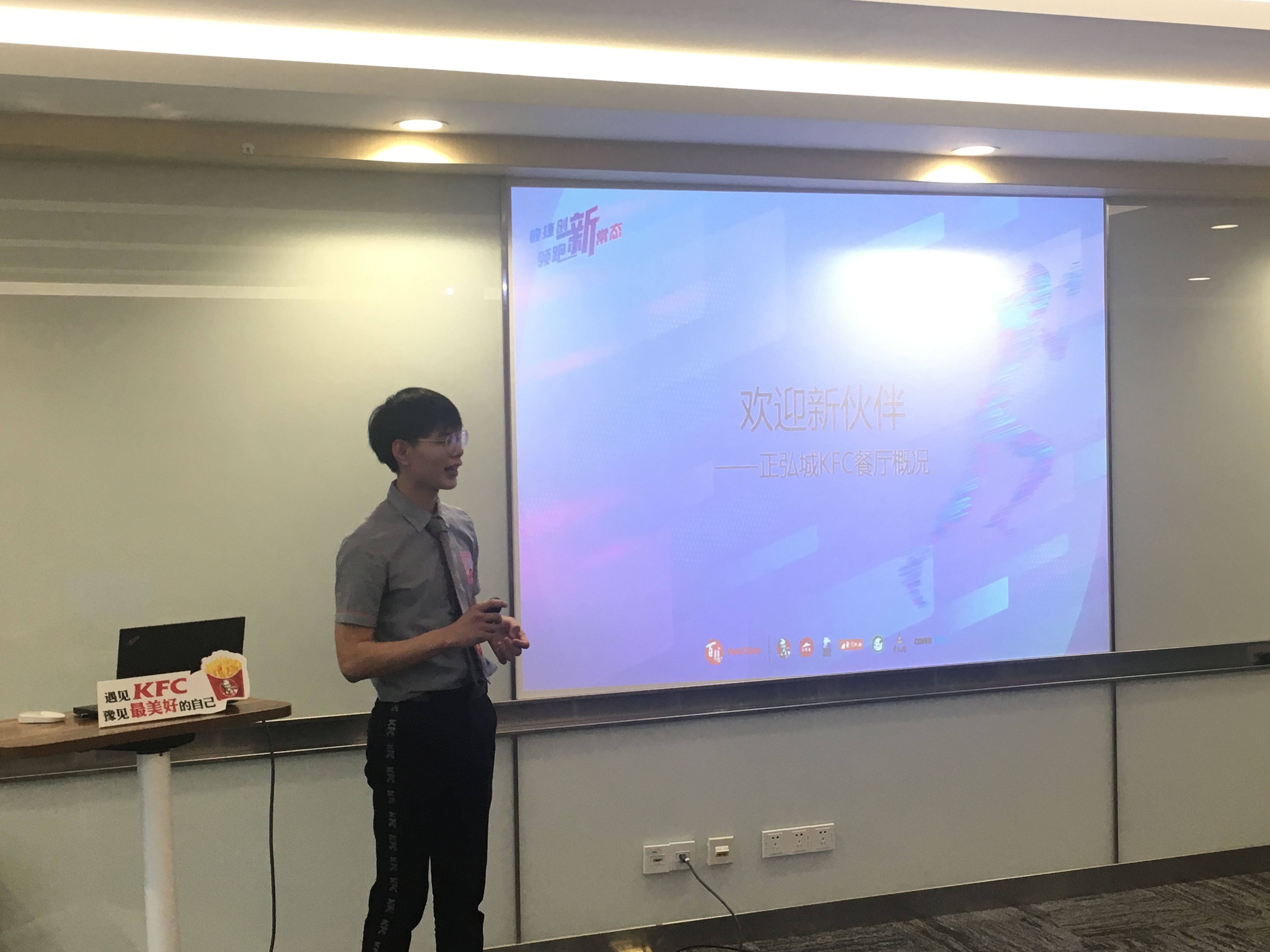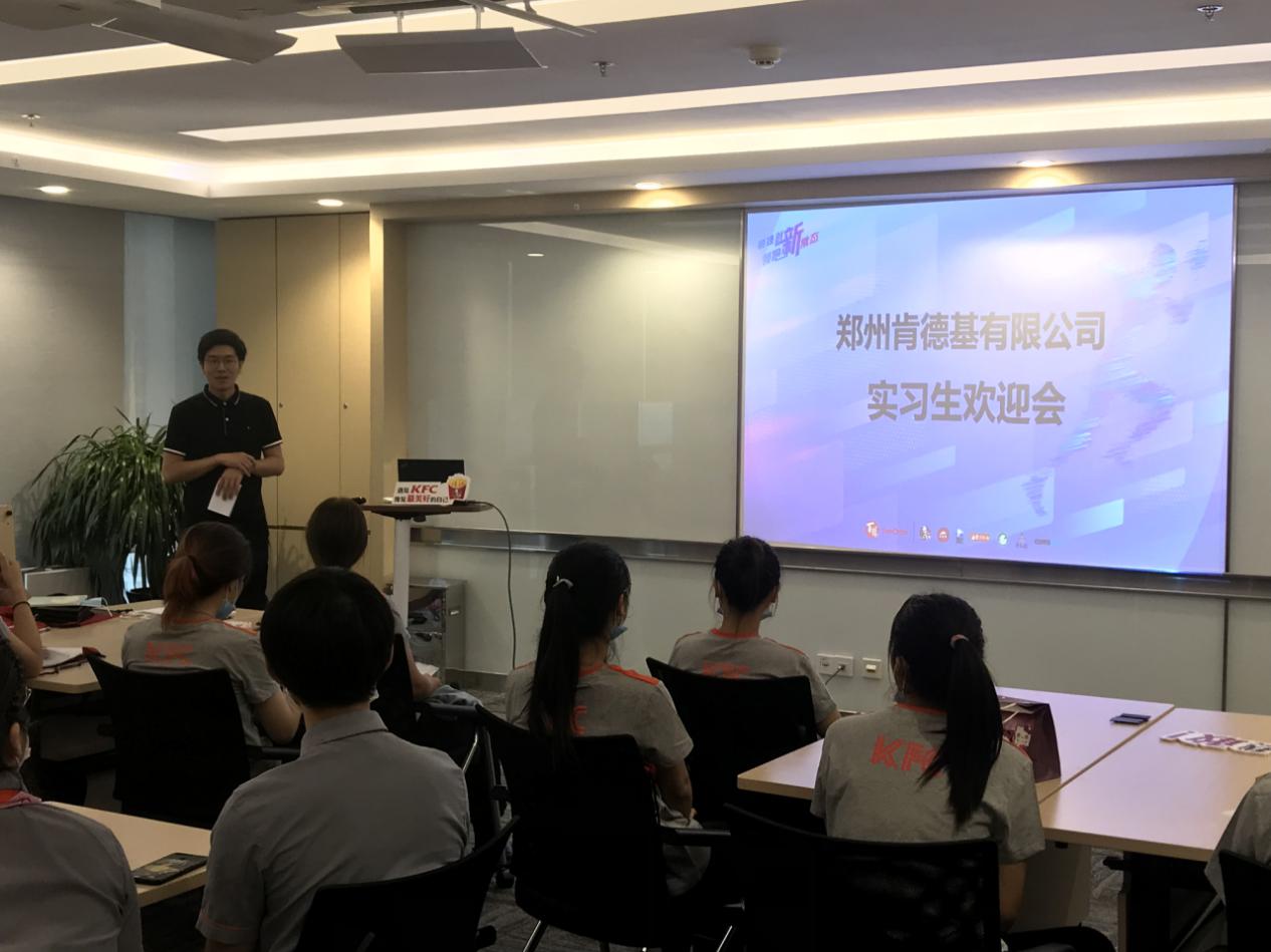 欢迎会开始,李永洋经理代表肯德基公司各位领导和全体同事向同学们表示热烈的欢迎。接着向大家介绍近几年百胜中国在河南的发展情况。百胜中国在河南以惊人的速度发展,不仅吸纳了小肥羊、东方既白、黄记煌等著名品牌,还开设了精品咖啡店Coffee&Joy,不断使产品本土化,多样化,未来预计每年在河南开设30家分店。